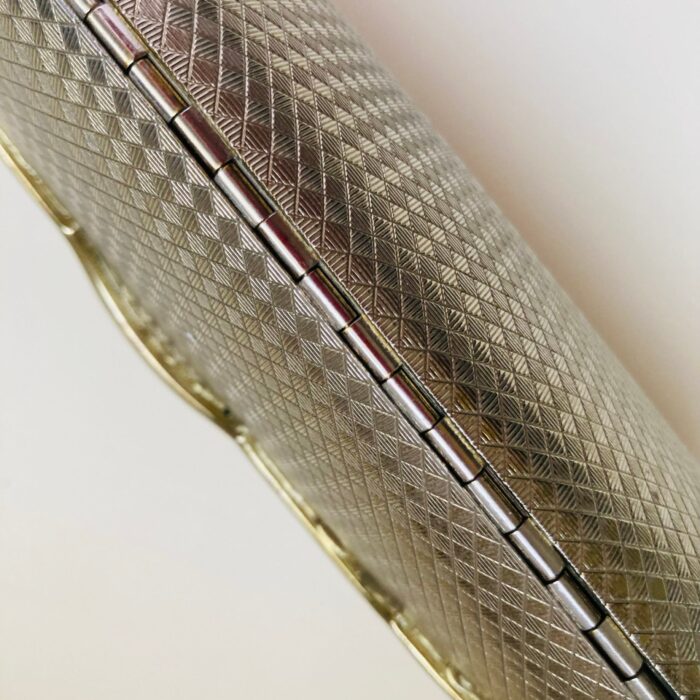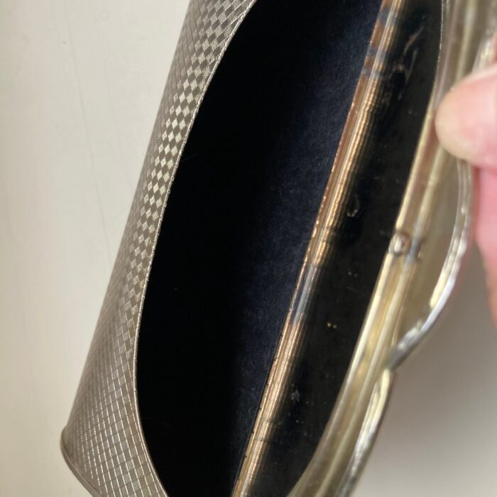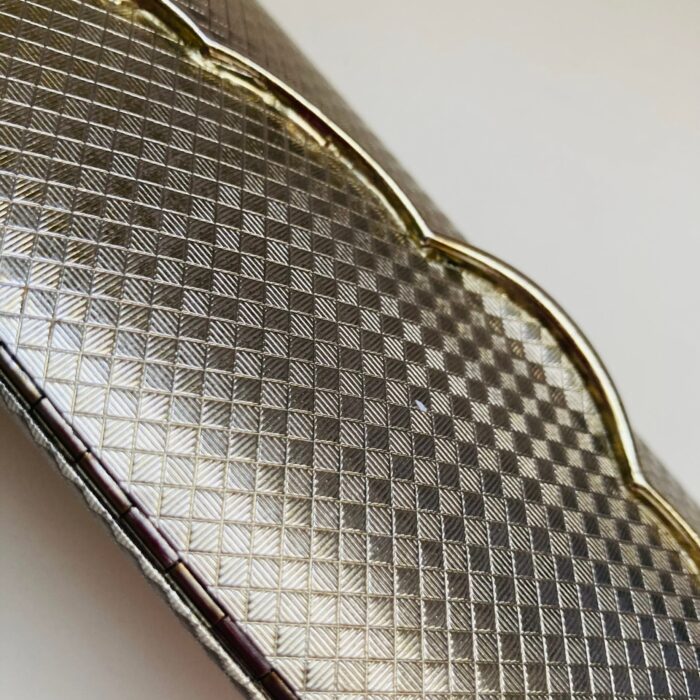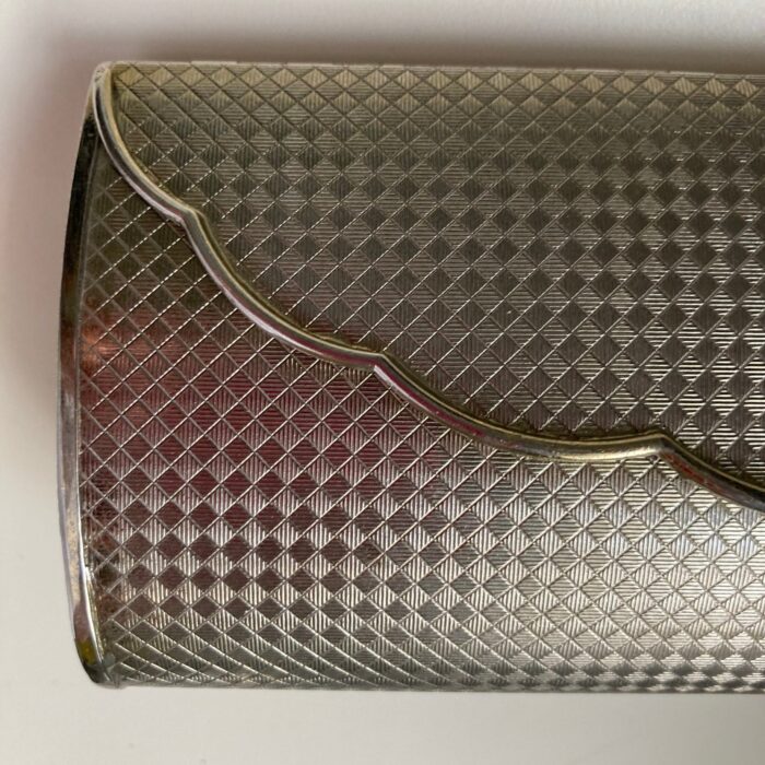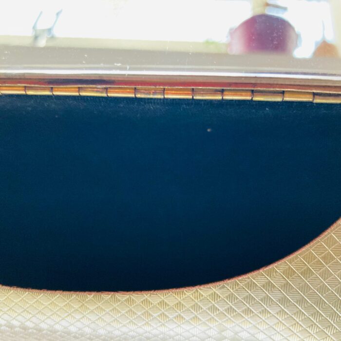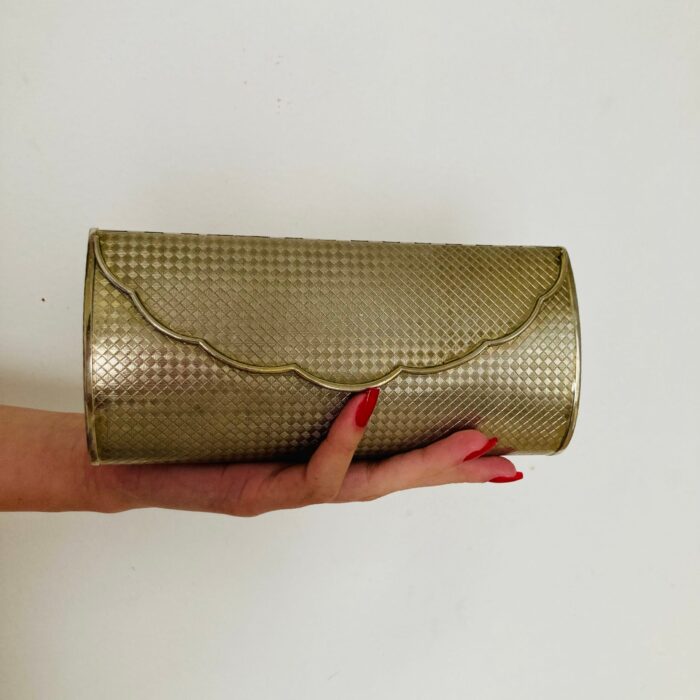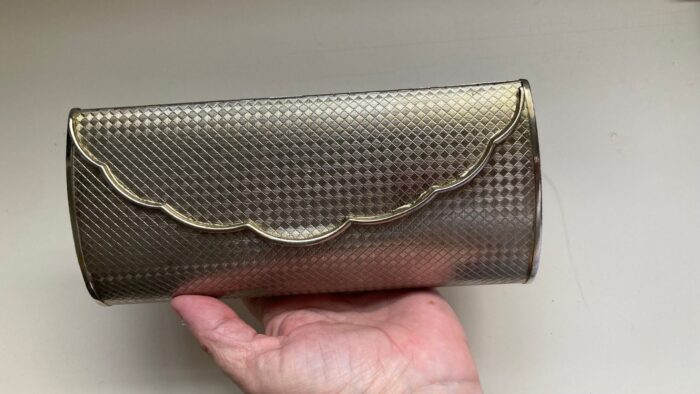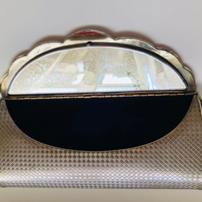 Em metal prateado, por dentro aveludado, com espelho na tampa