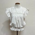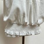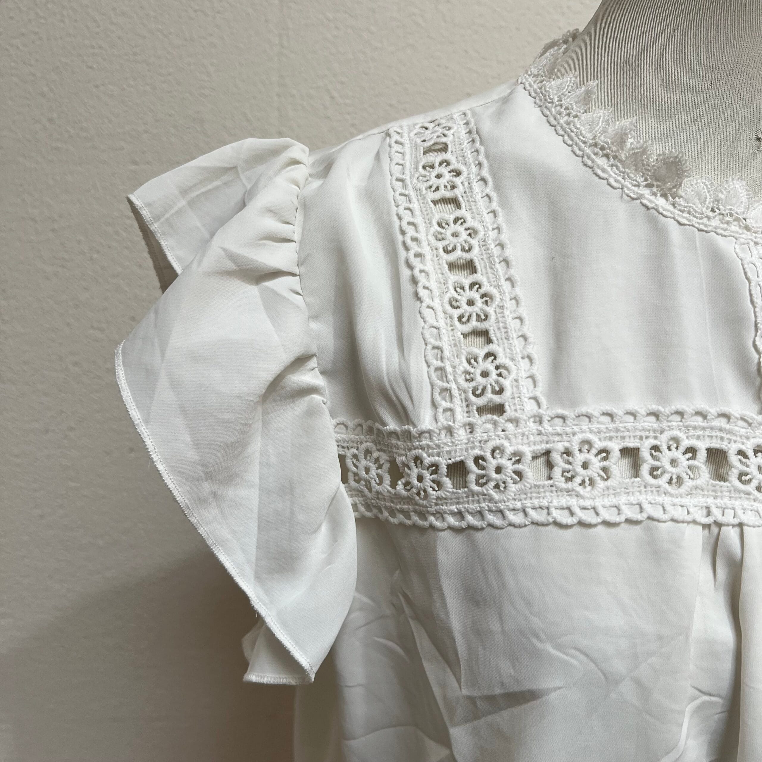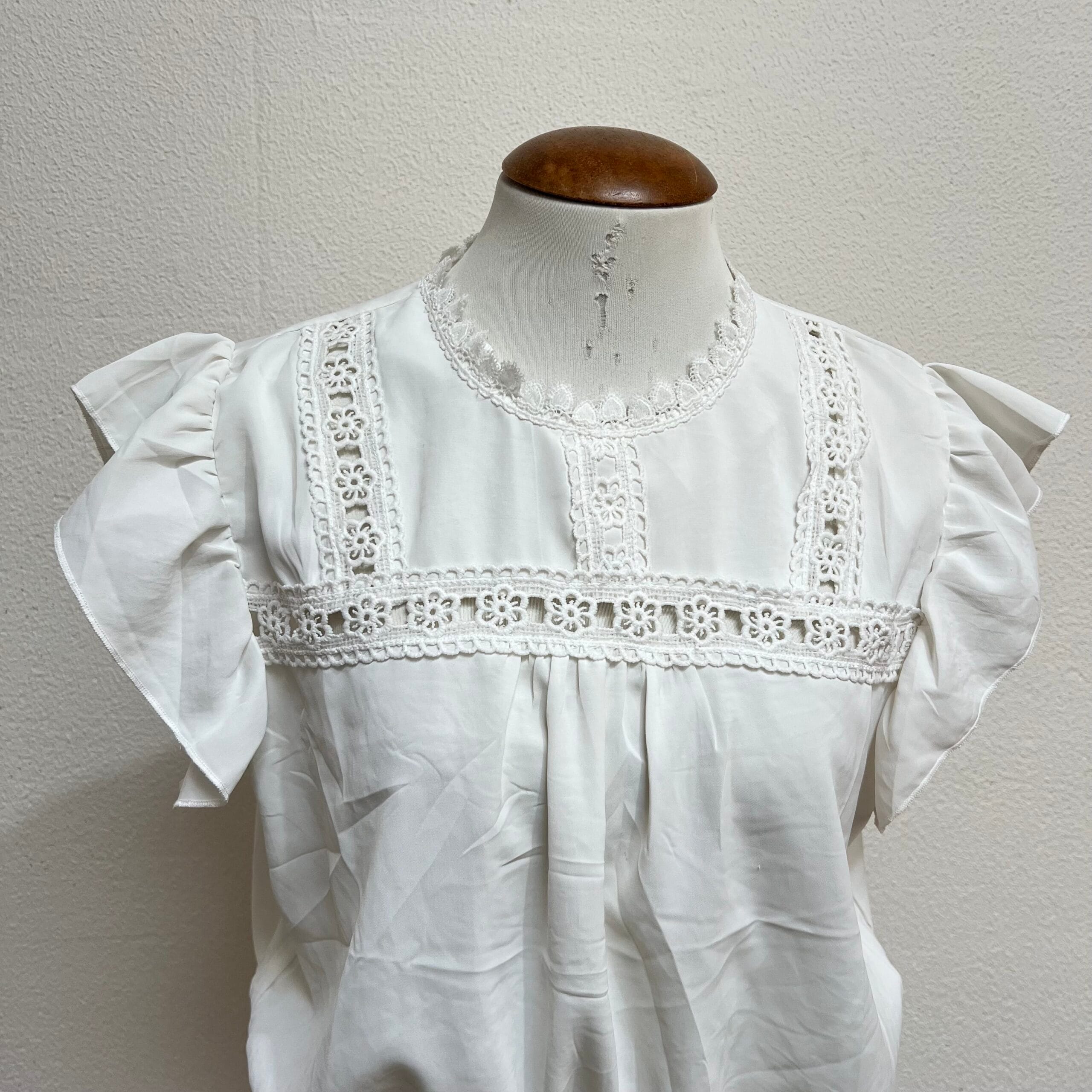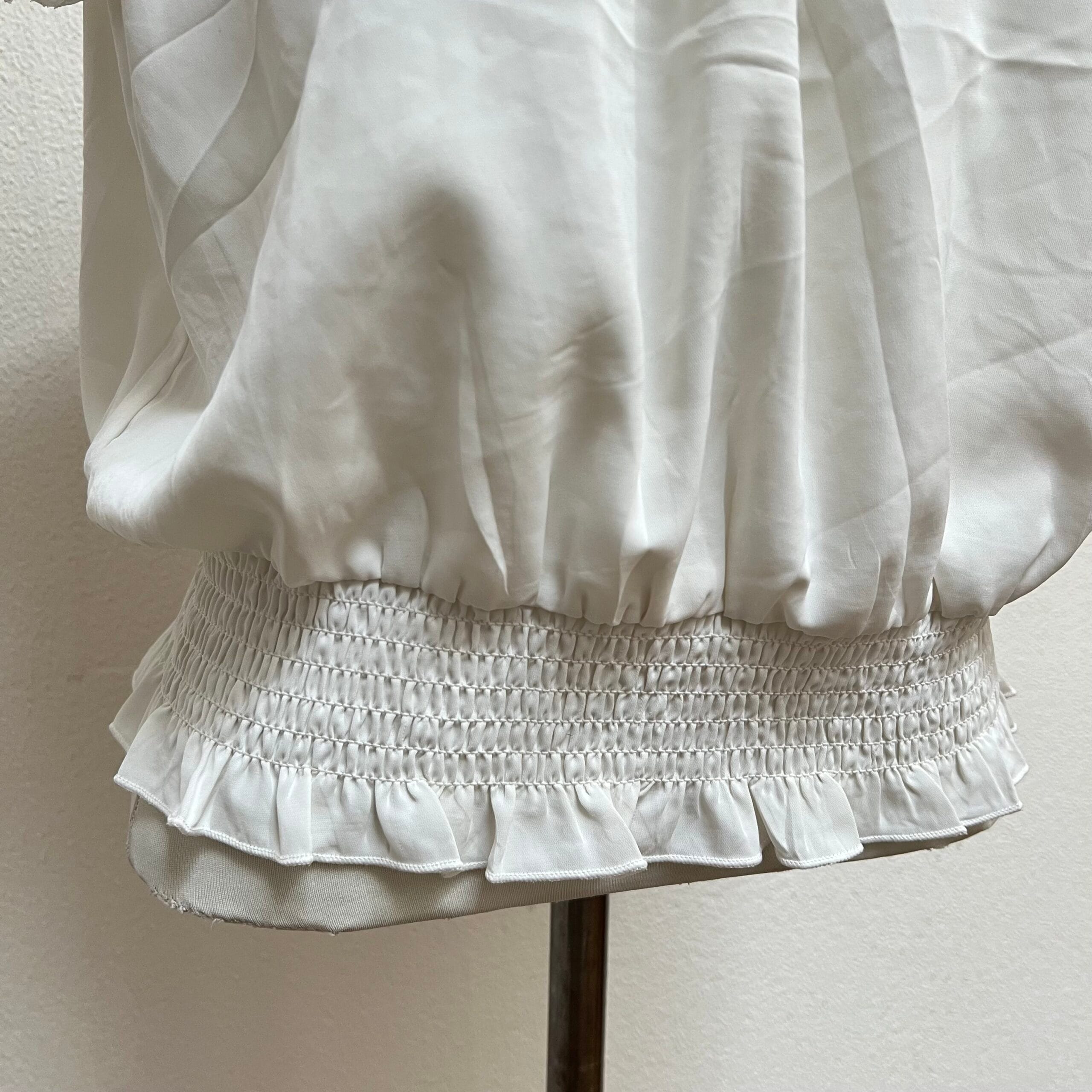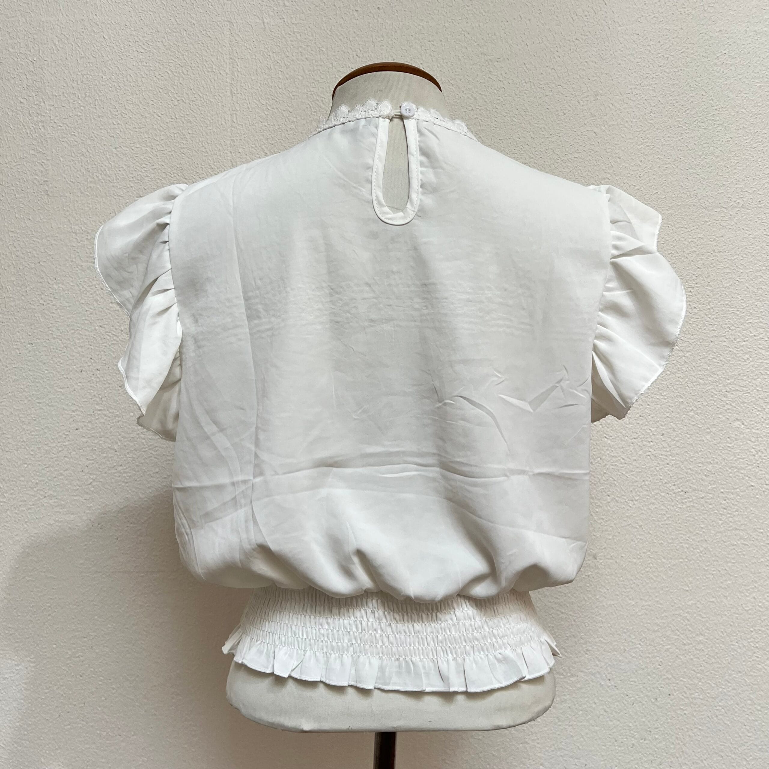 Blusa branca com detalhes em renda, babadinhos nas mangas e elástico na barra. Veste M