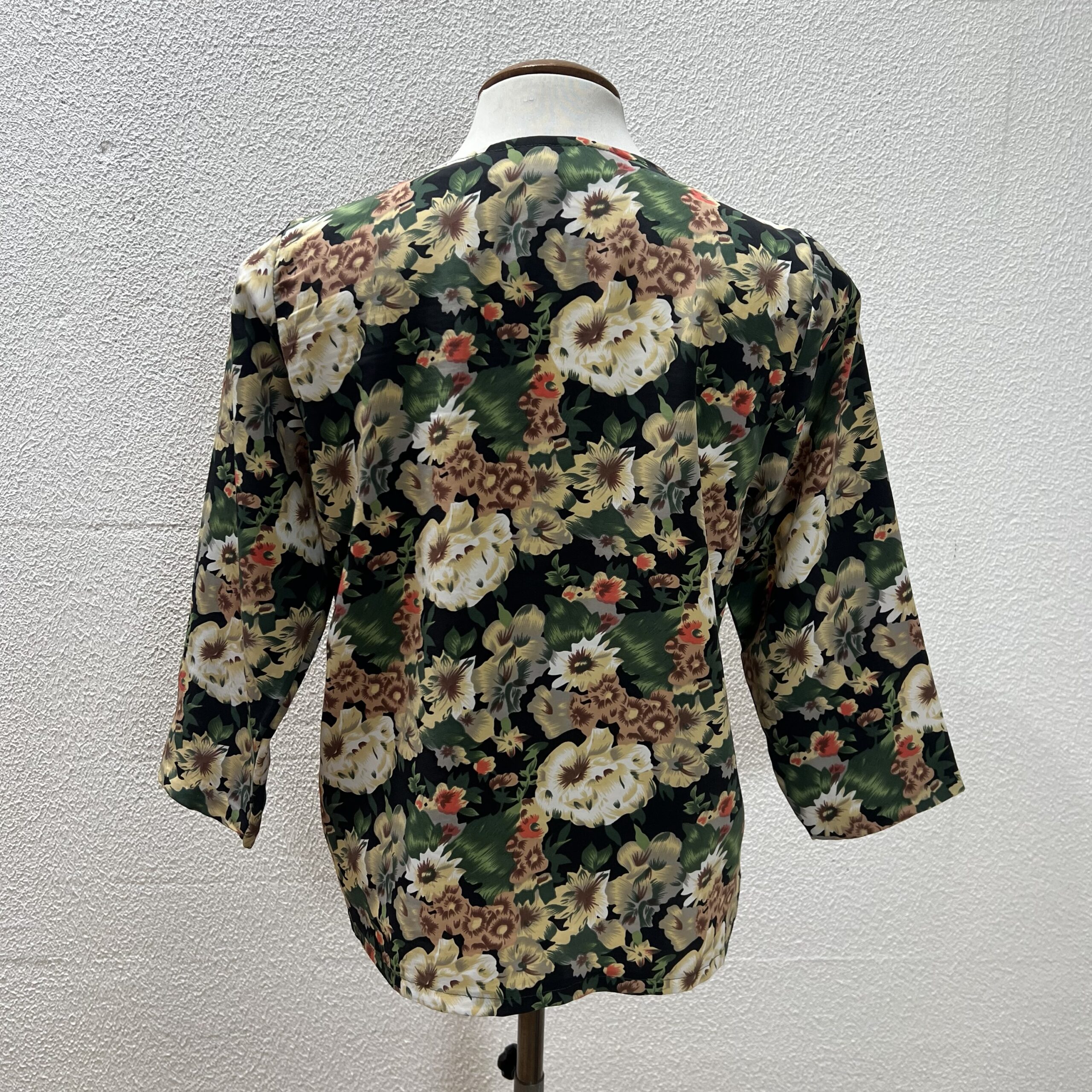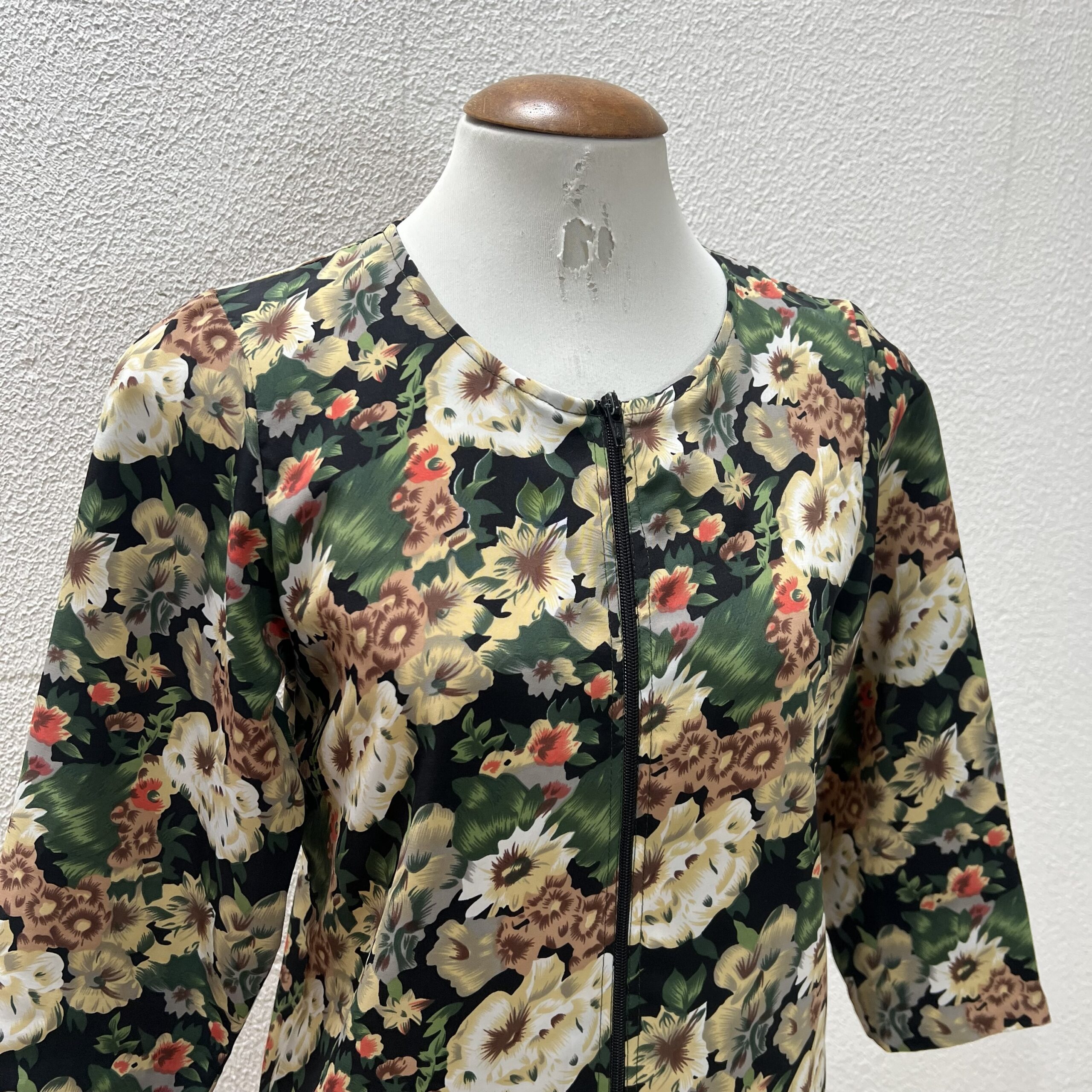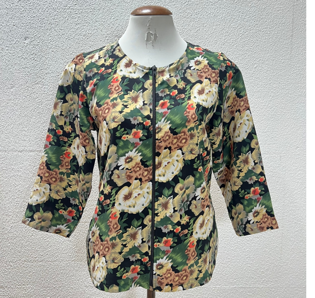Blusa verde floral com mnga 7/8. Fechamento com zíper na parte da frente. Veste M.