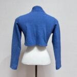 Bolero azul, em algodão e poliéster. Possui fechamento com um botão na parte da frente. Veste PP