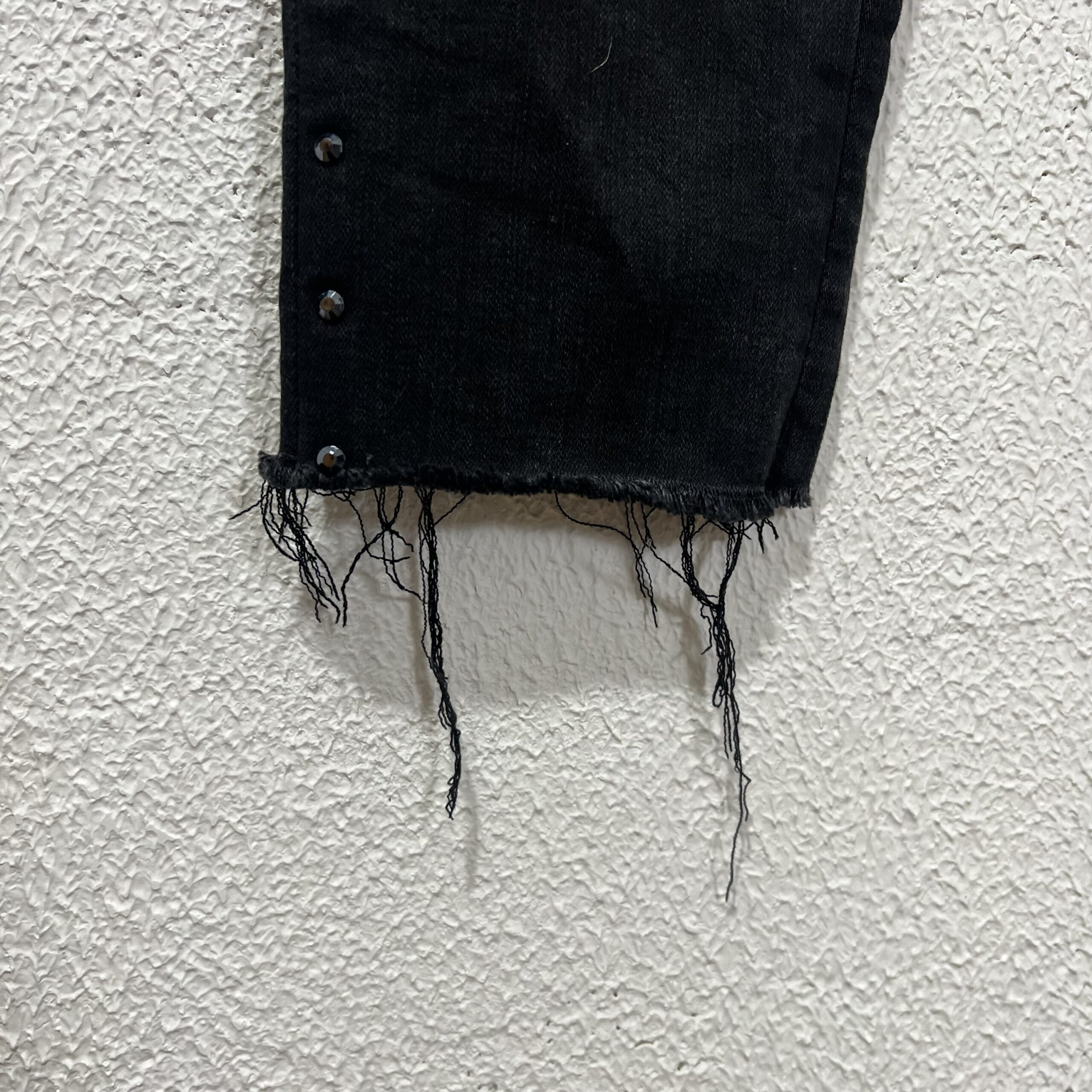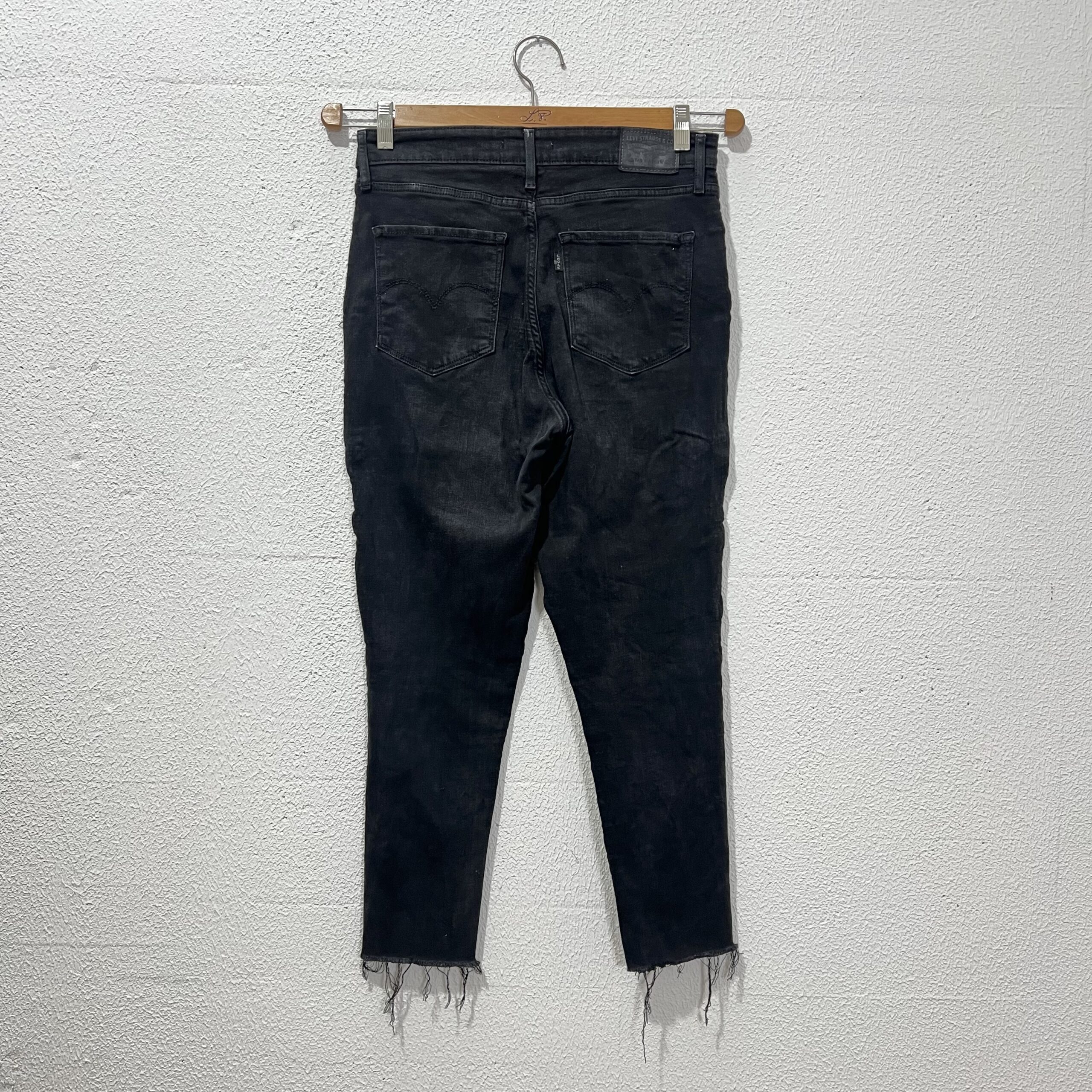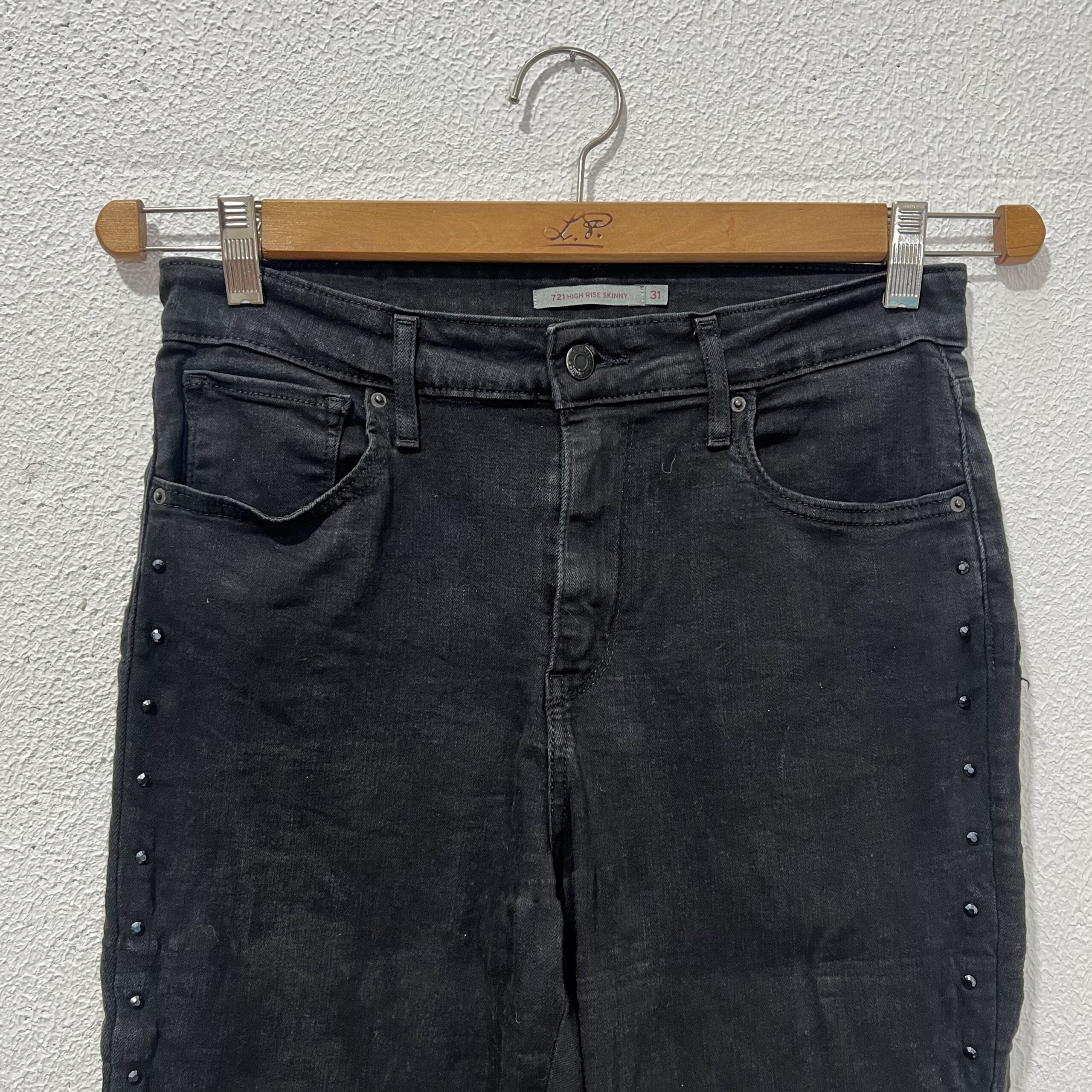 Calça Jeans Preta Skinny da Levi’s com pedrinhas nas laterais e bolsos na frente e atrás. Veste M