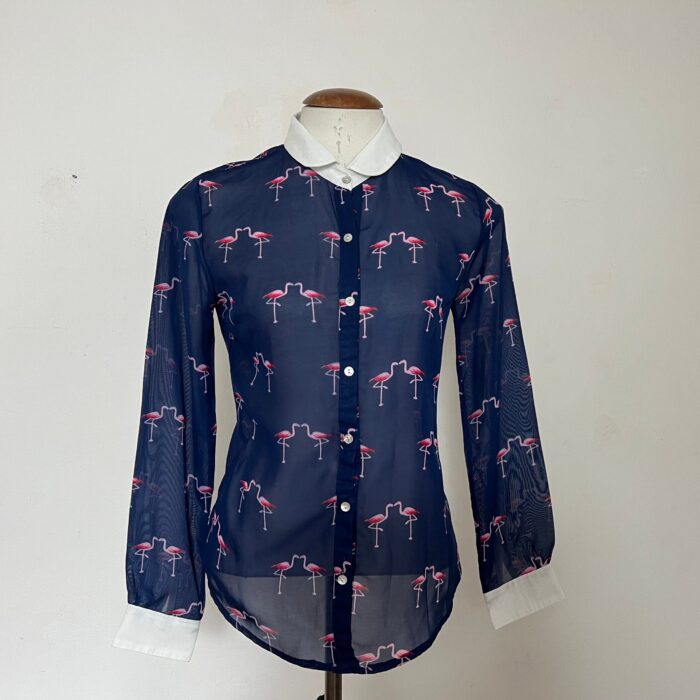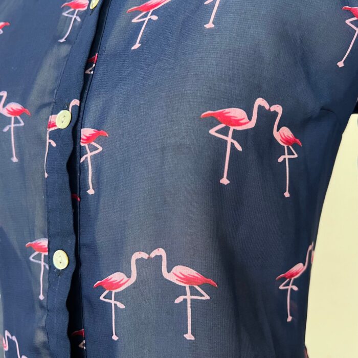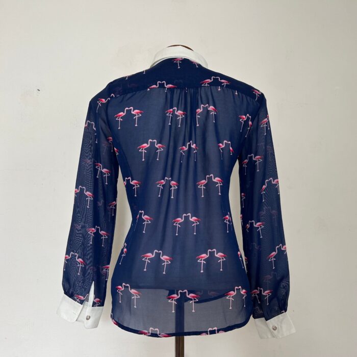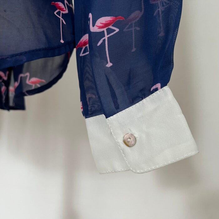 Camisa azul com desenhos de flamingos e gola branca, tecido em poliéster. O tecido possui transparência.
