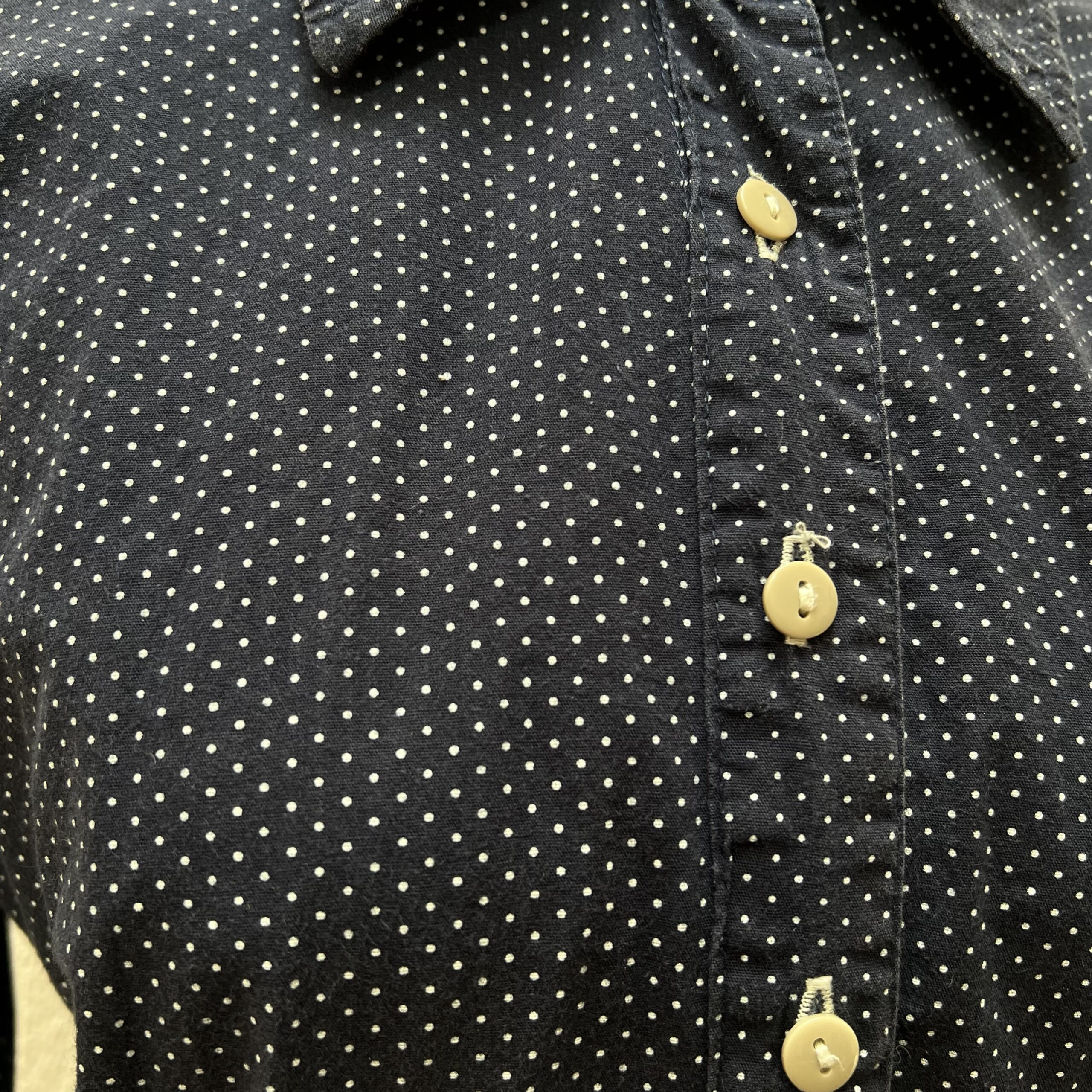 Camisa feminina em tecido leve. Modelo de manga longa, com gola tradicional e fechamento frontal por botões. Estampa de poá em fundo azul-marinho. Caimento ajustado ao corpo e acabamento clássico. Peça versátil para uso casual ou profissional. Veste: M