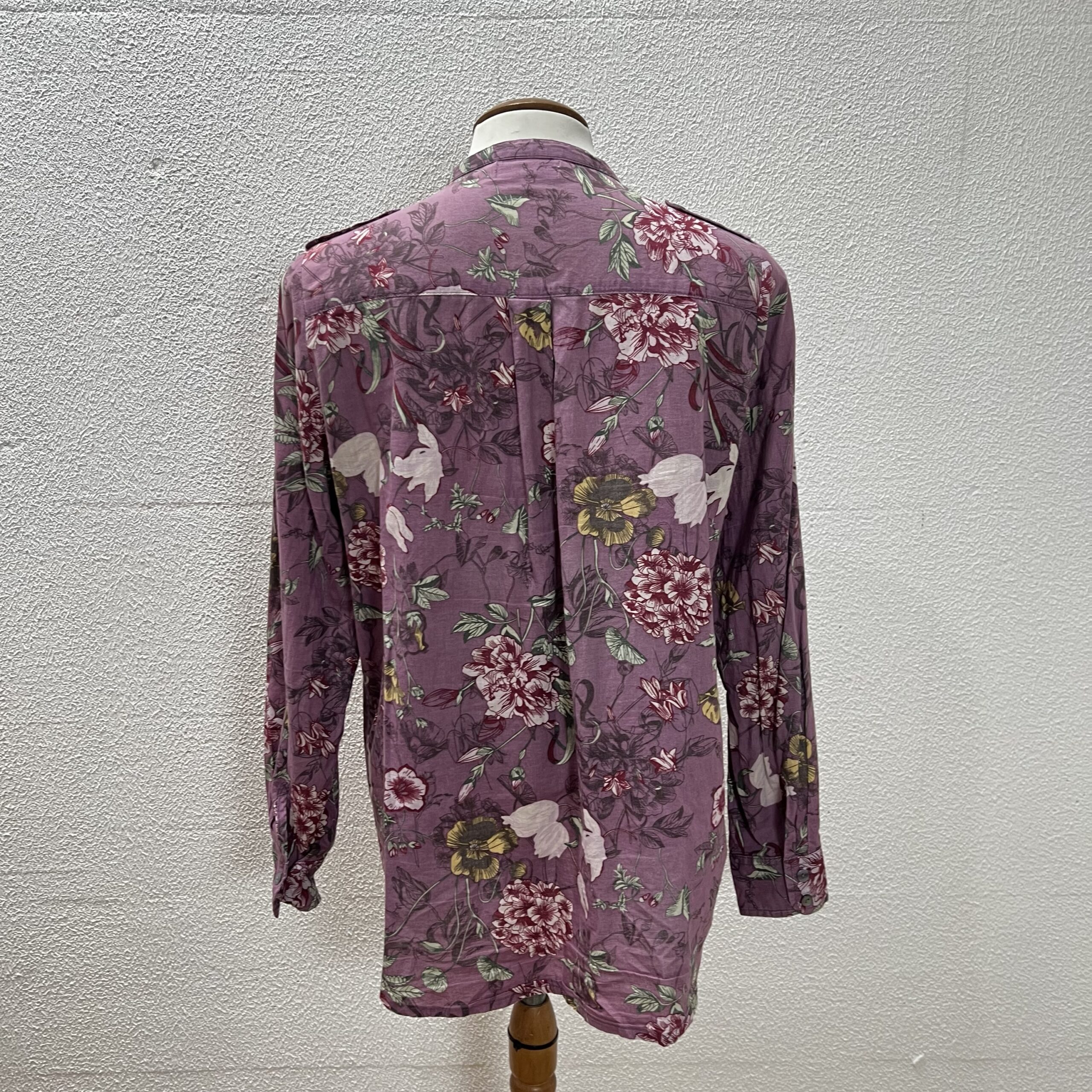 Camisa floral roxa, sem gola em 100% algodão. Fechamento com botões na parte da frente e nos punhos. Veste G