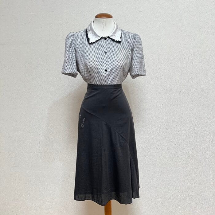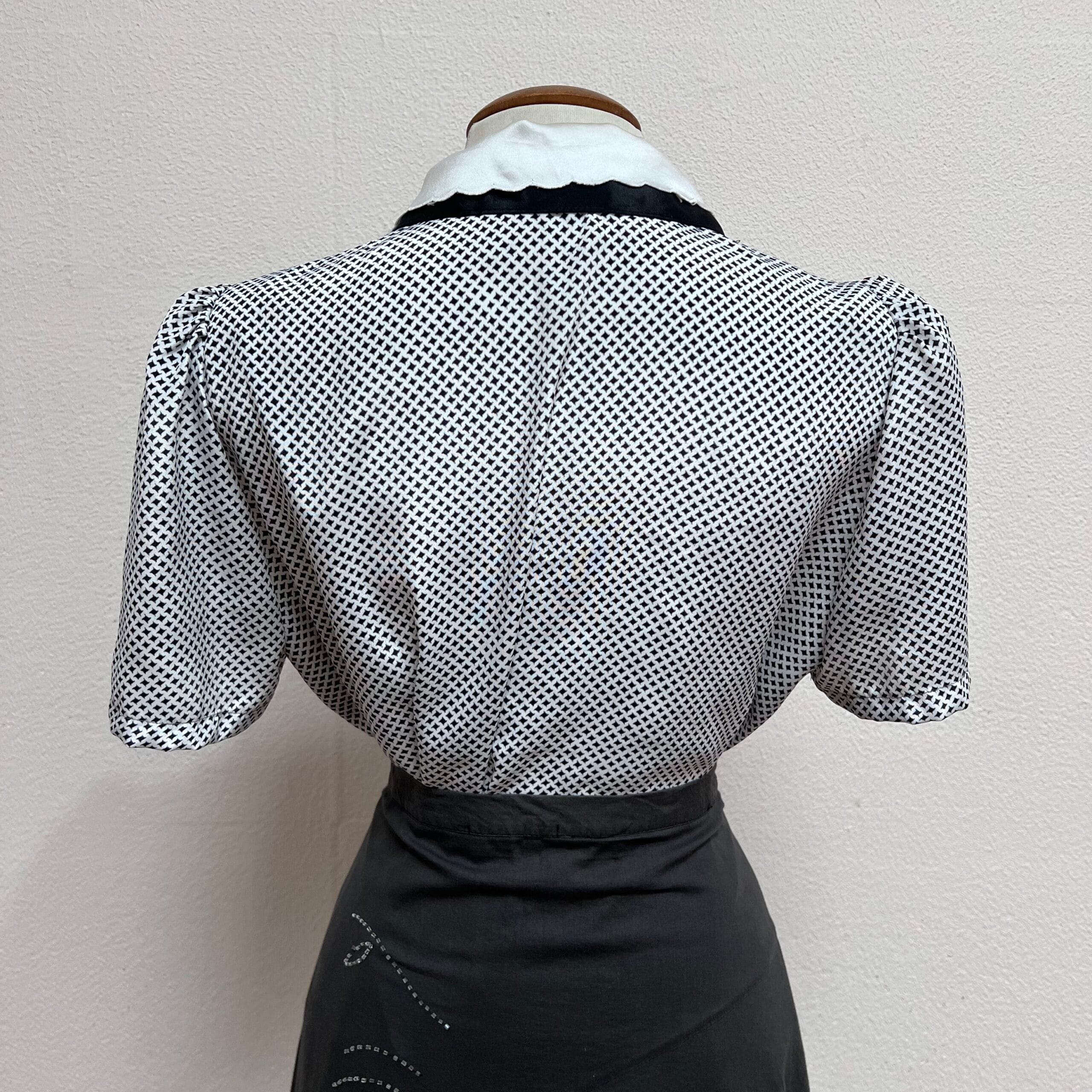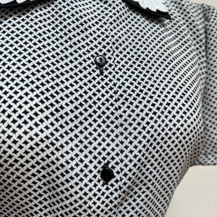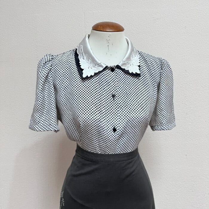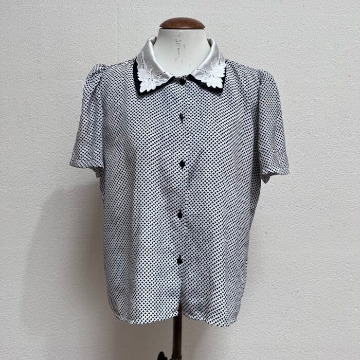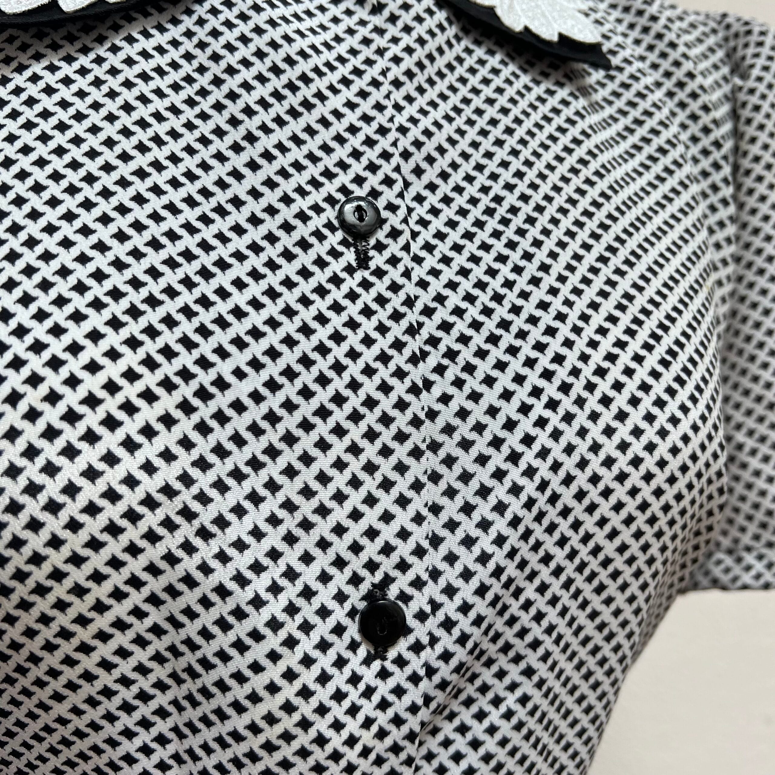 Camisa Vintage com bordados na gola, tecido acetinado, estampa xadrez em preto e branco. Com ombreiras e fechamento com botões na parte da frente. Veste M/G (modelagem ampla)