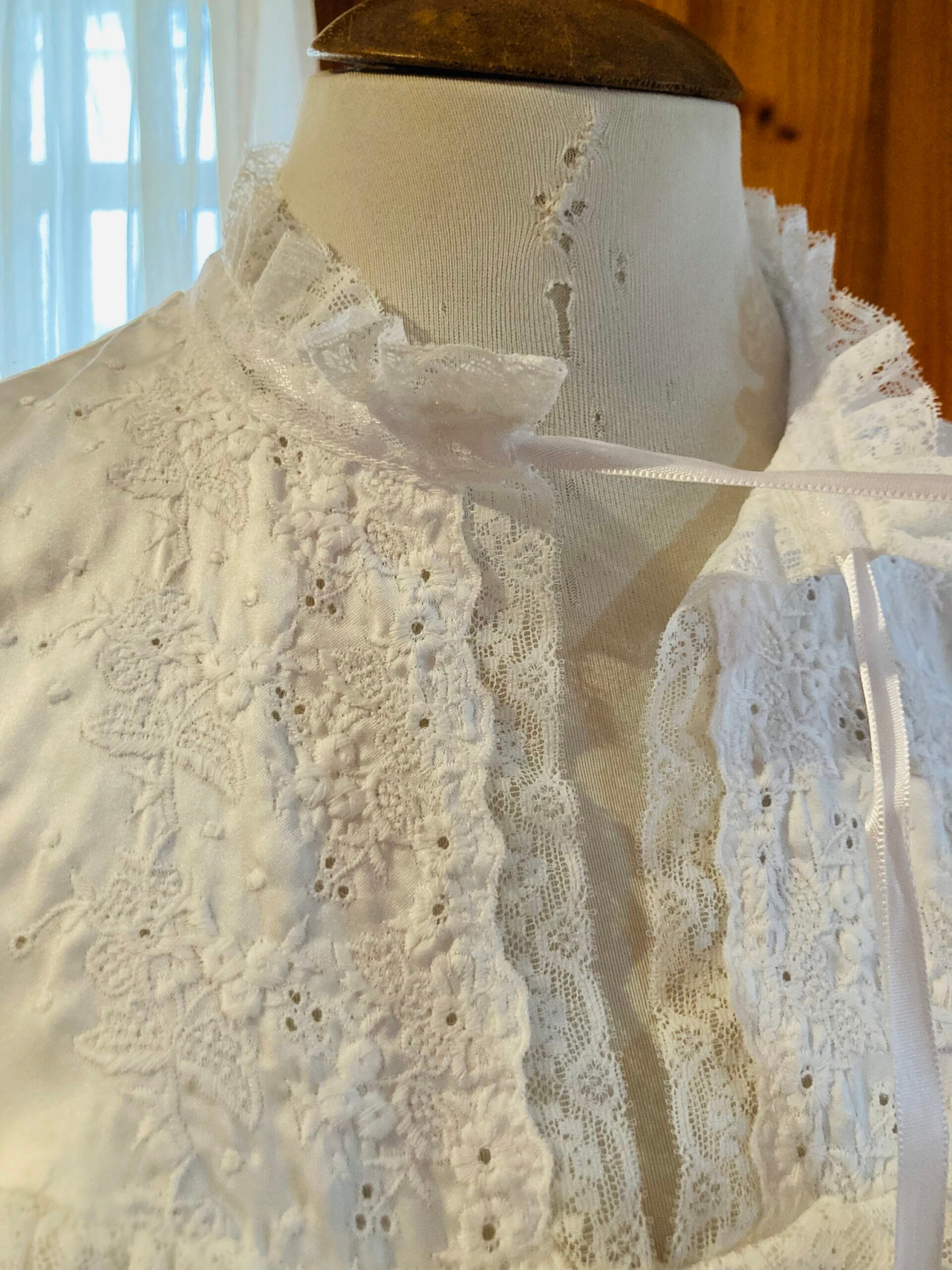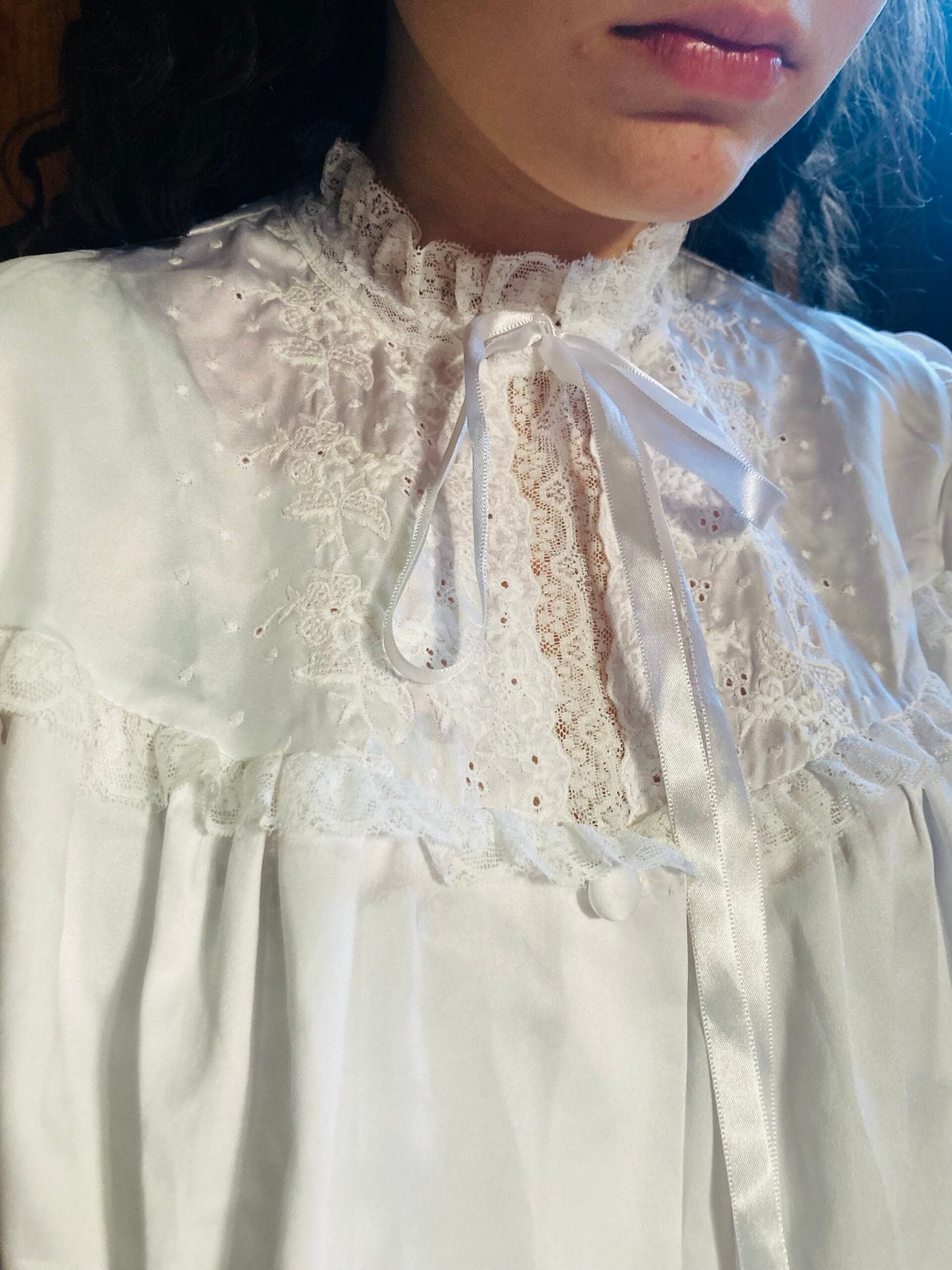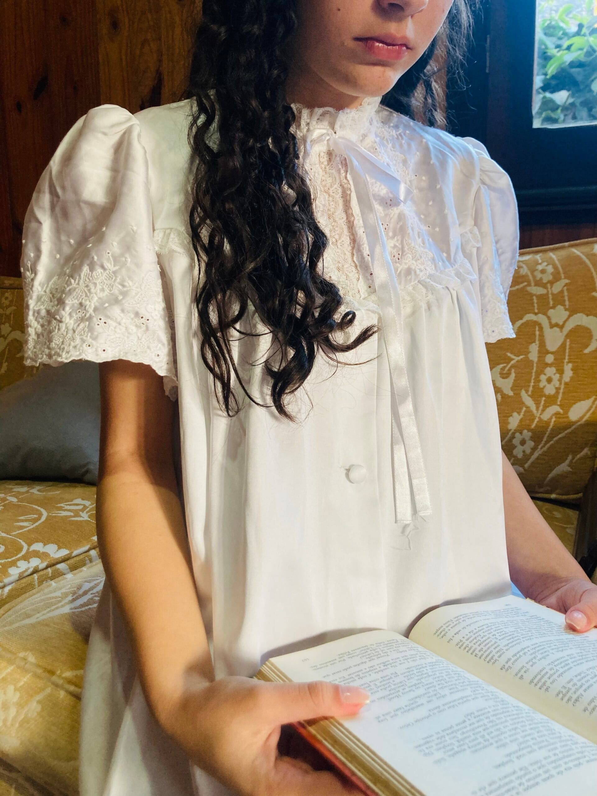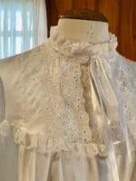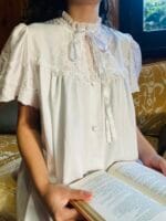 Camisola em cetim branca, com bolsos nas laterais, gola em renda, rica em detalhes de bordados no busto e nas mangas. Fechamento com botões na frente.