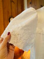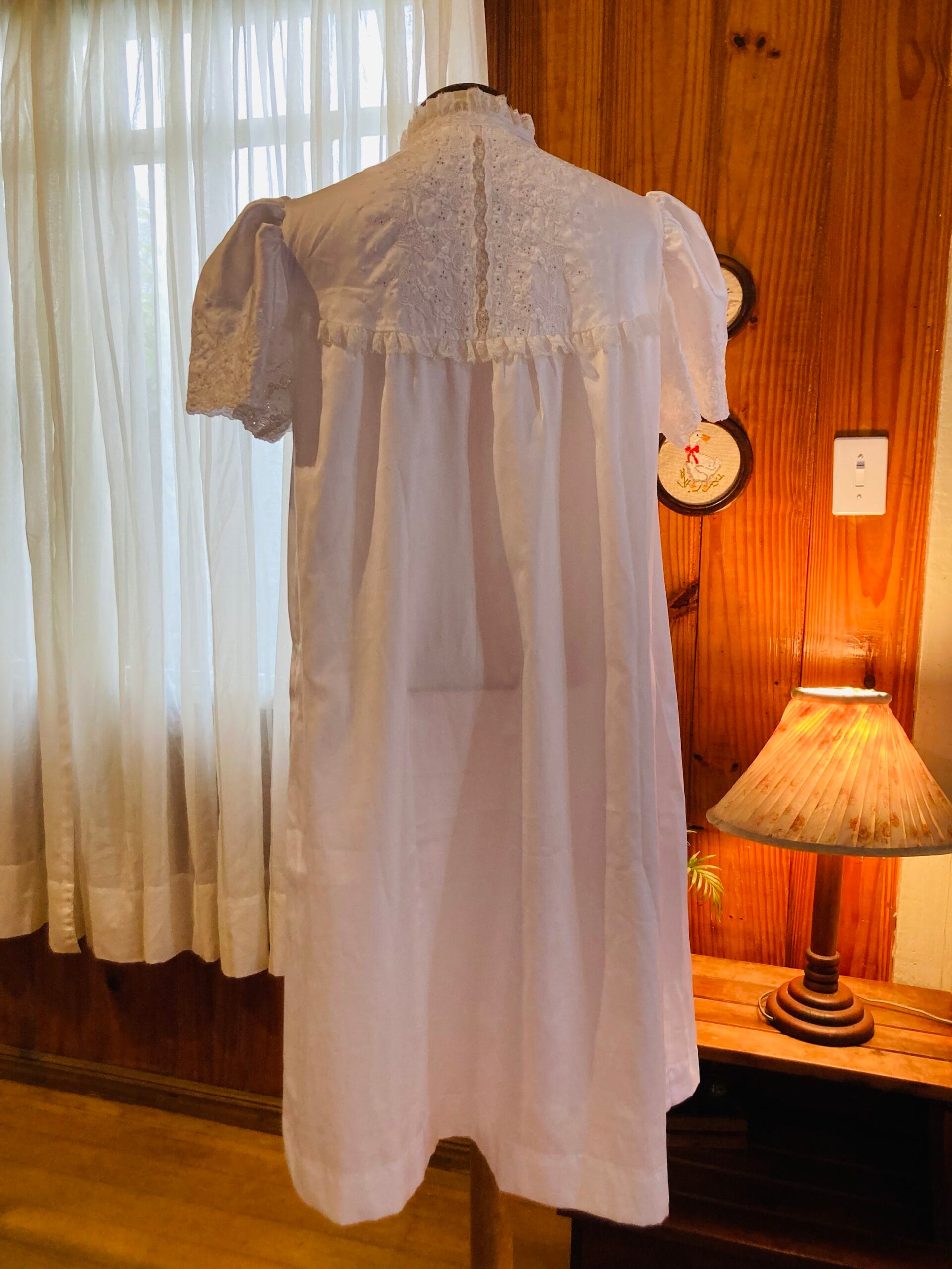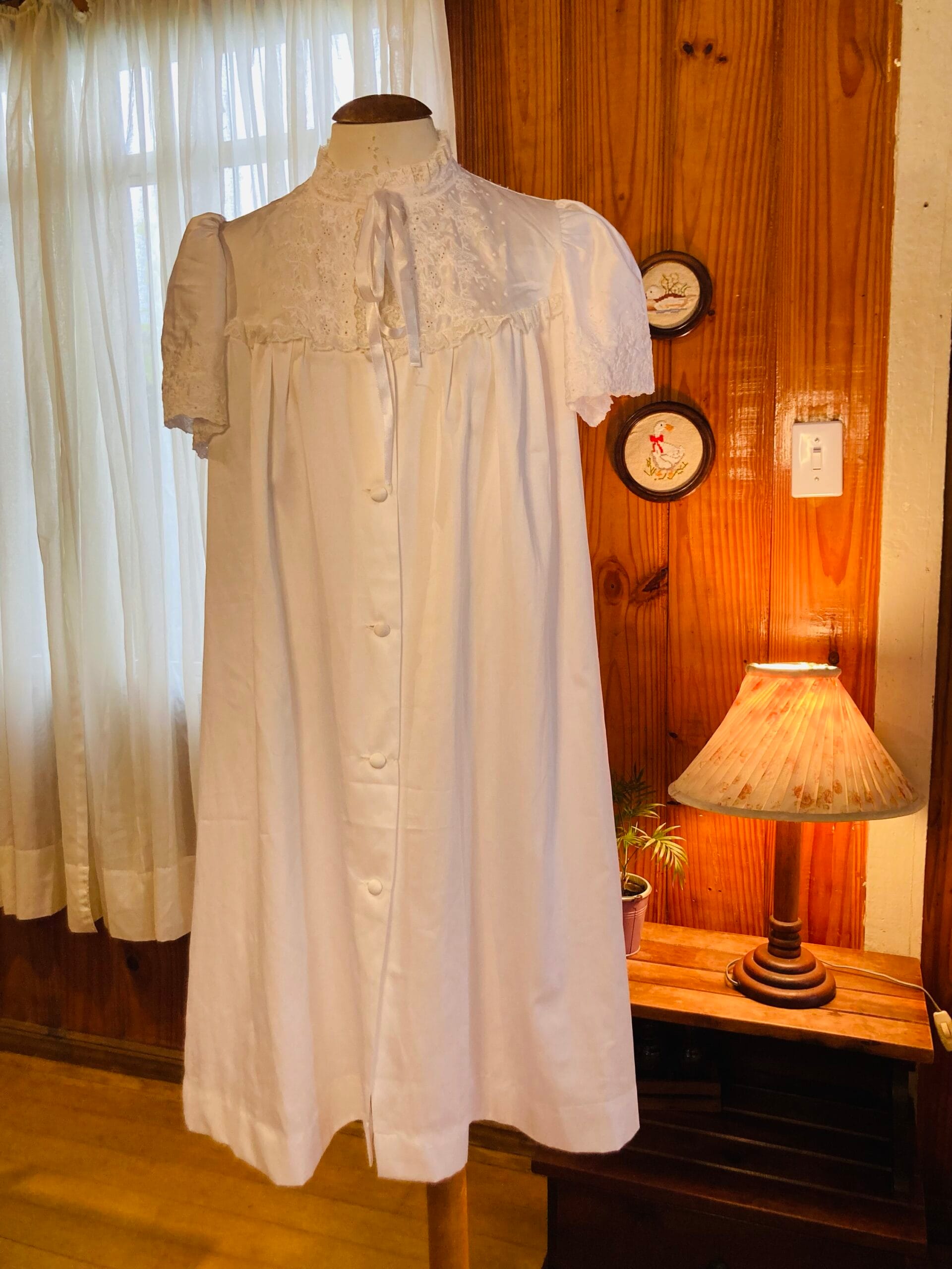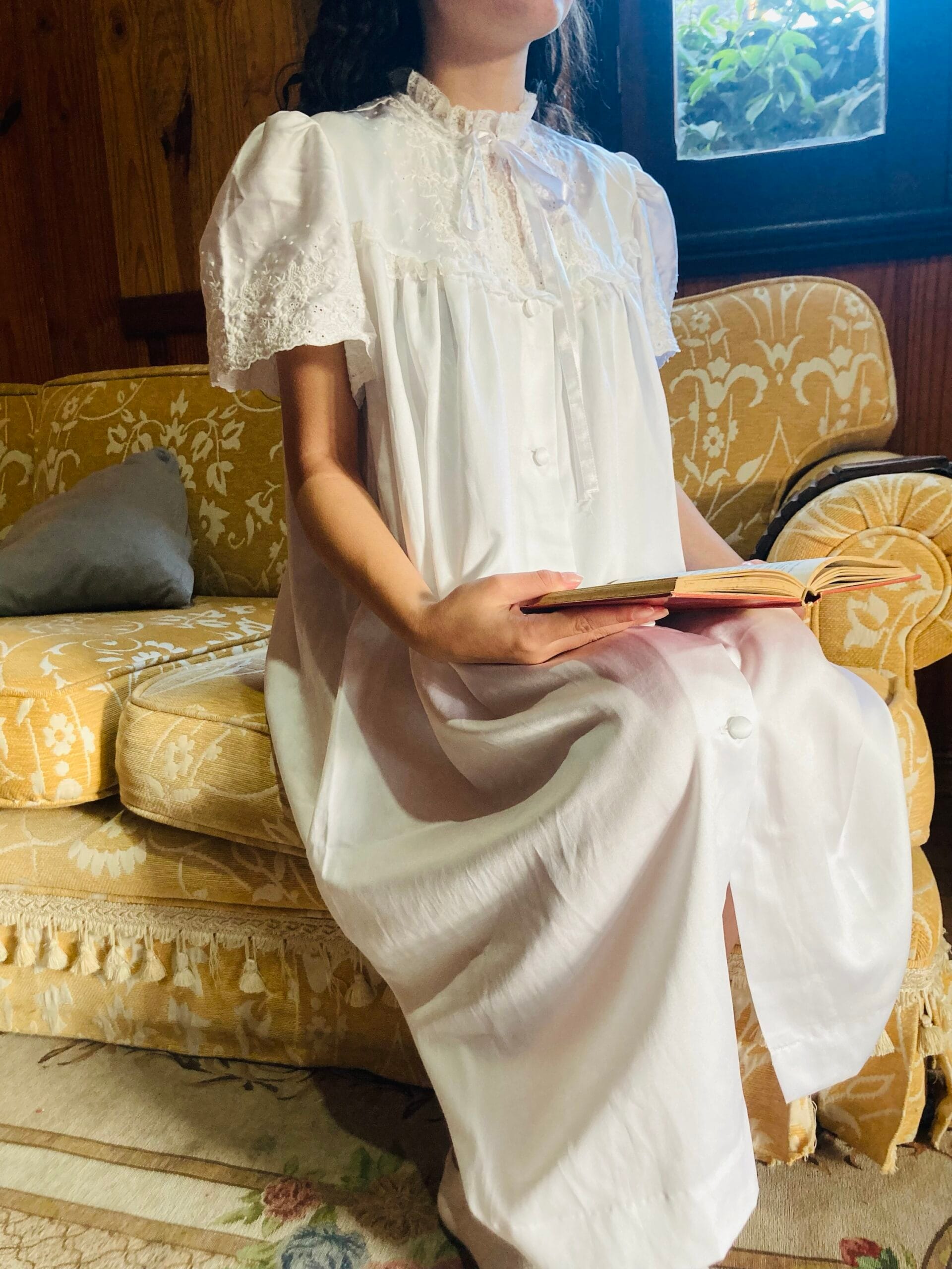 Camisola em cetim branca, com bolsos nas laterais, gola em renda, rica em detalhes de bordados no busto e nas mangas. Fechamento com botões na frente.