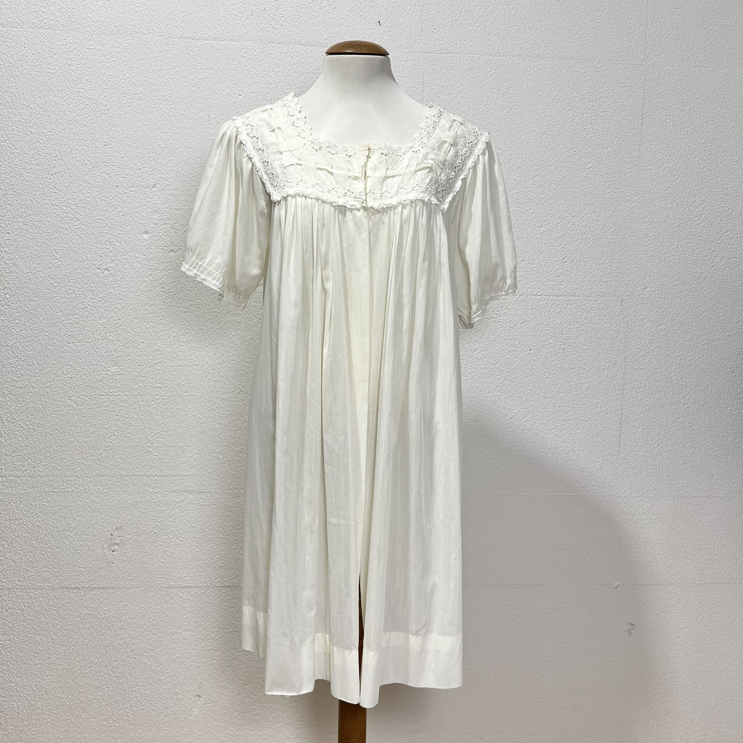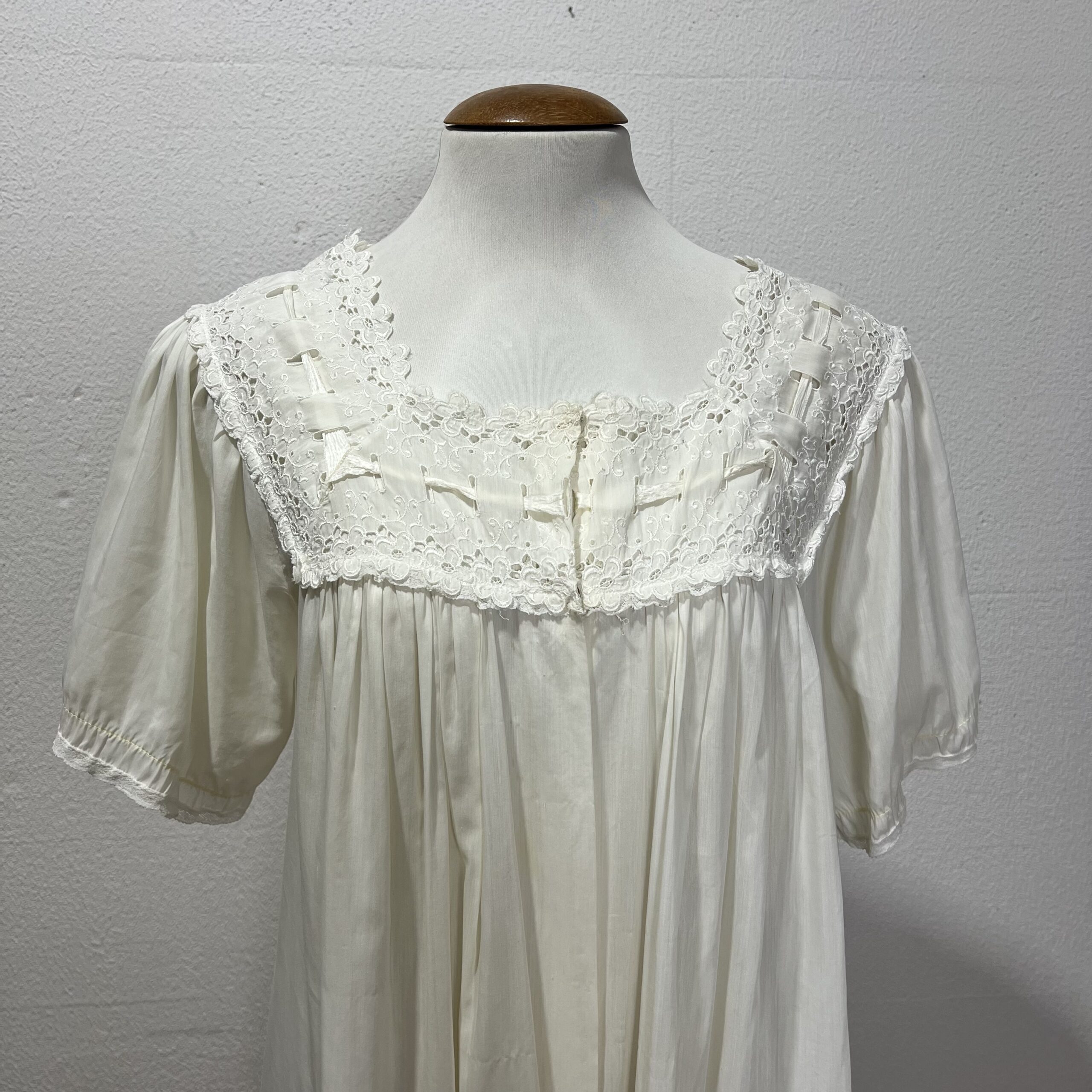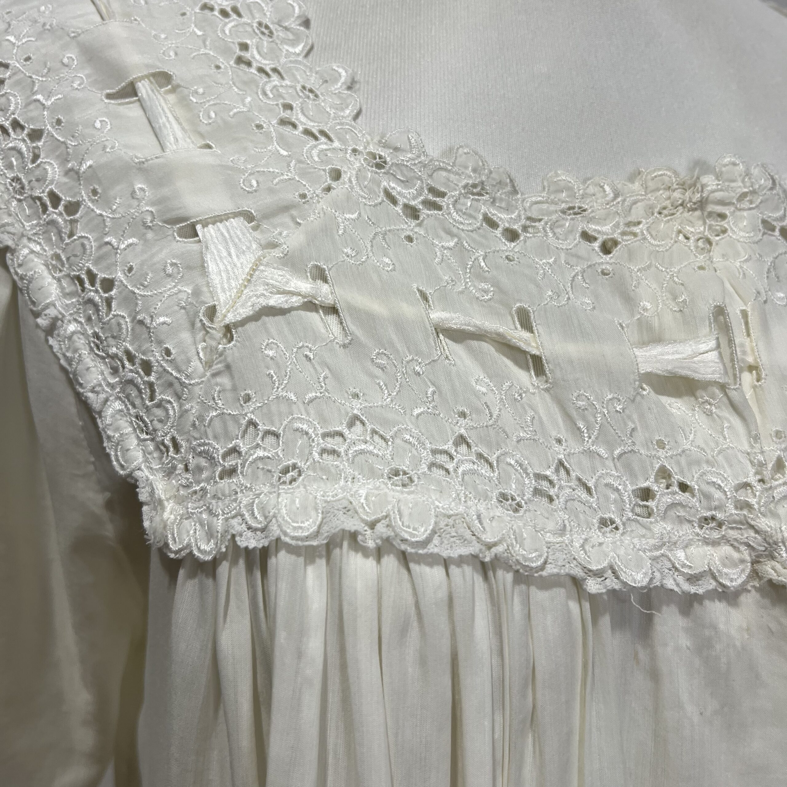 Camisola na cor amarelo clarinho. Detalhes de bordados e rendas nas mangas, no busto e na gola. Veste G