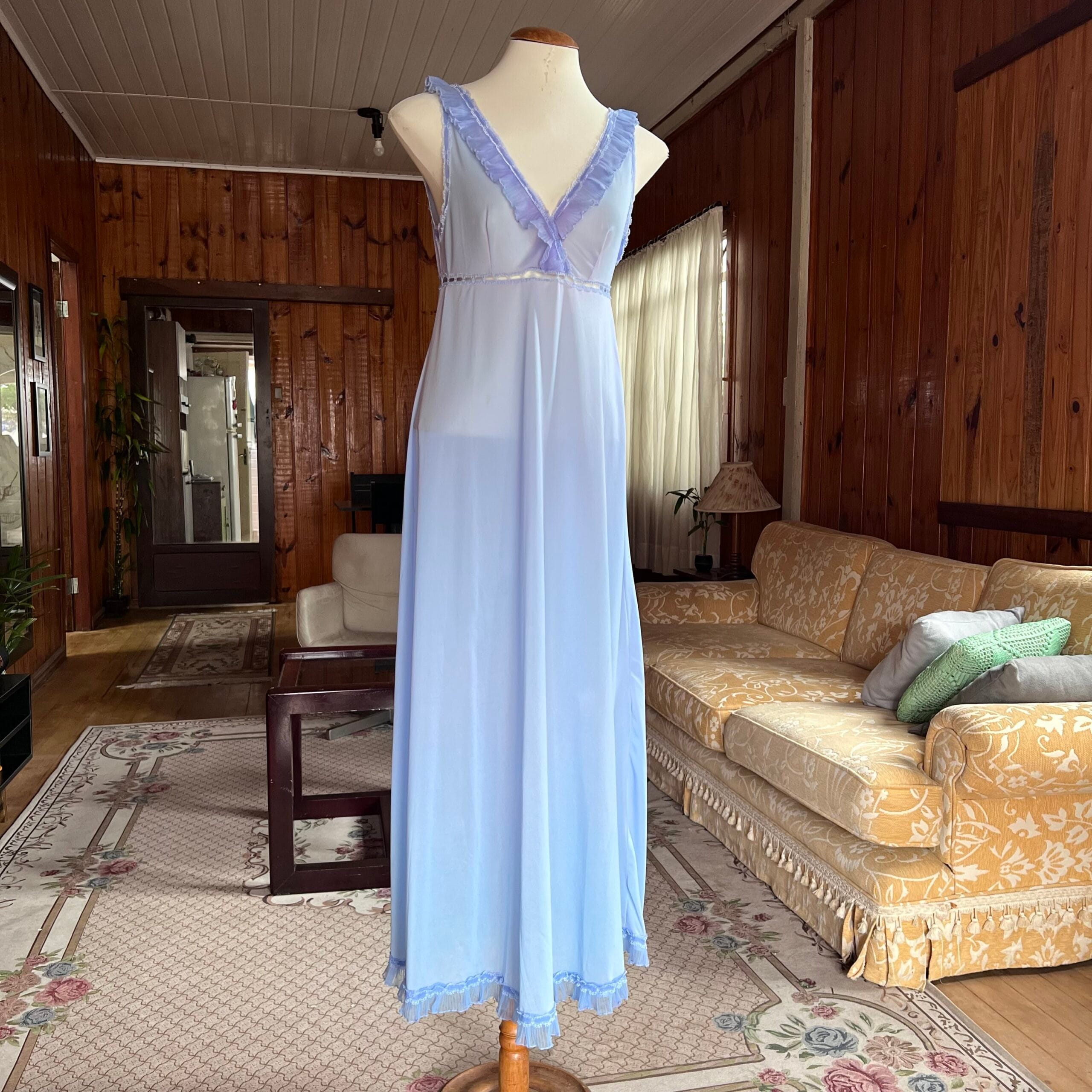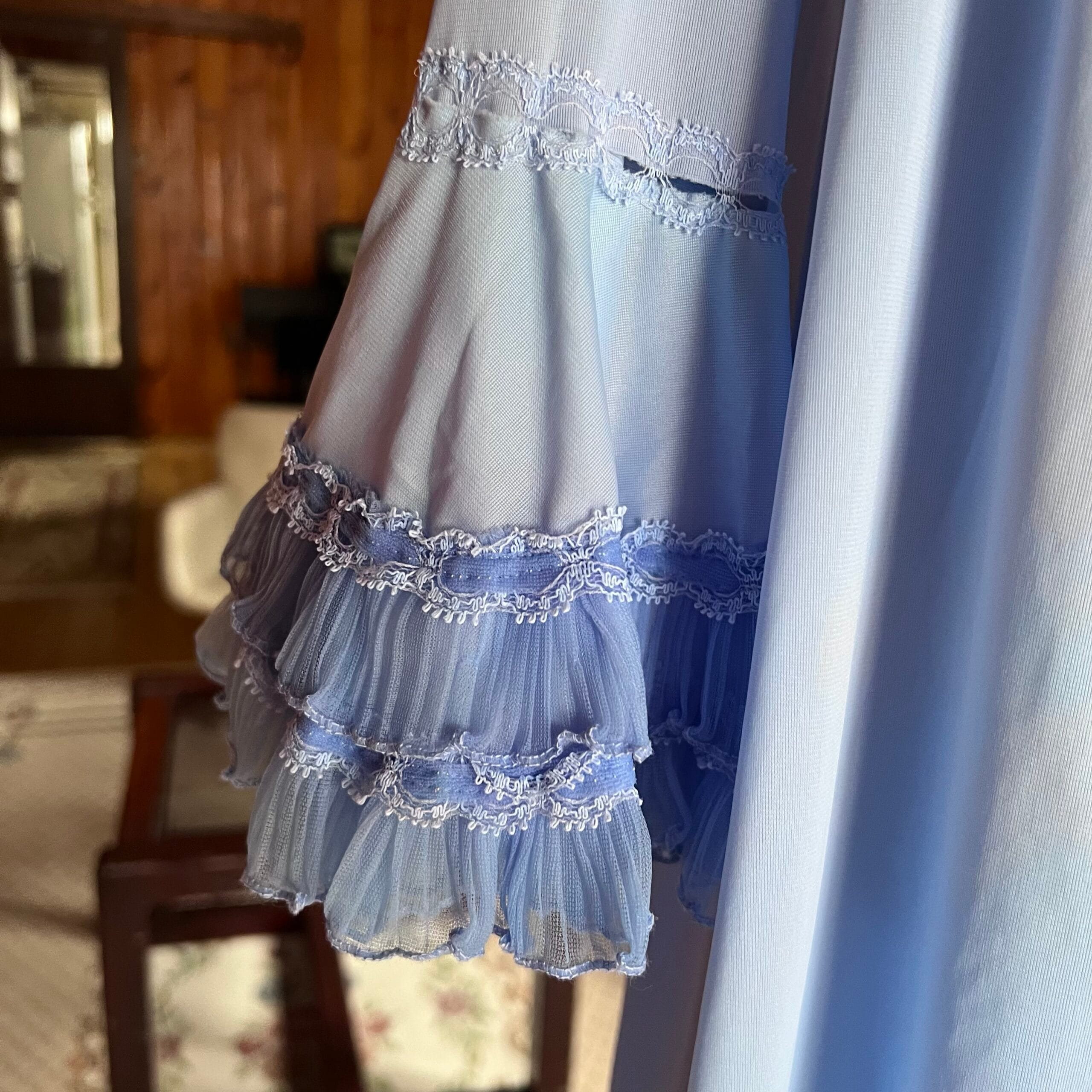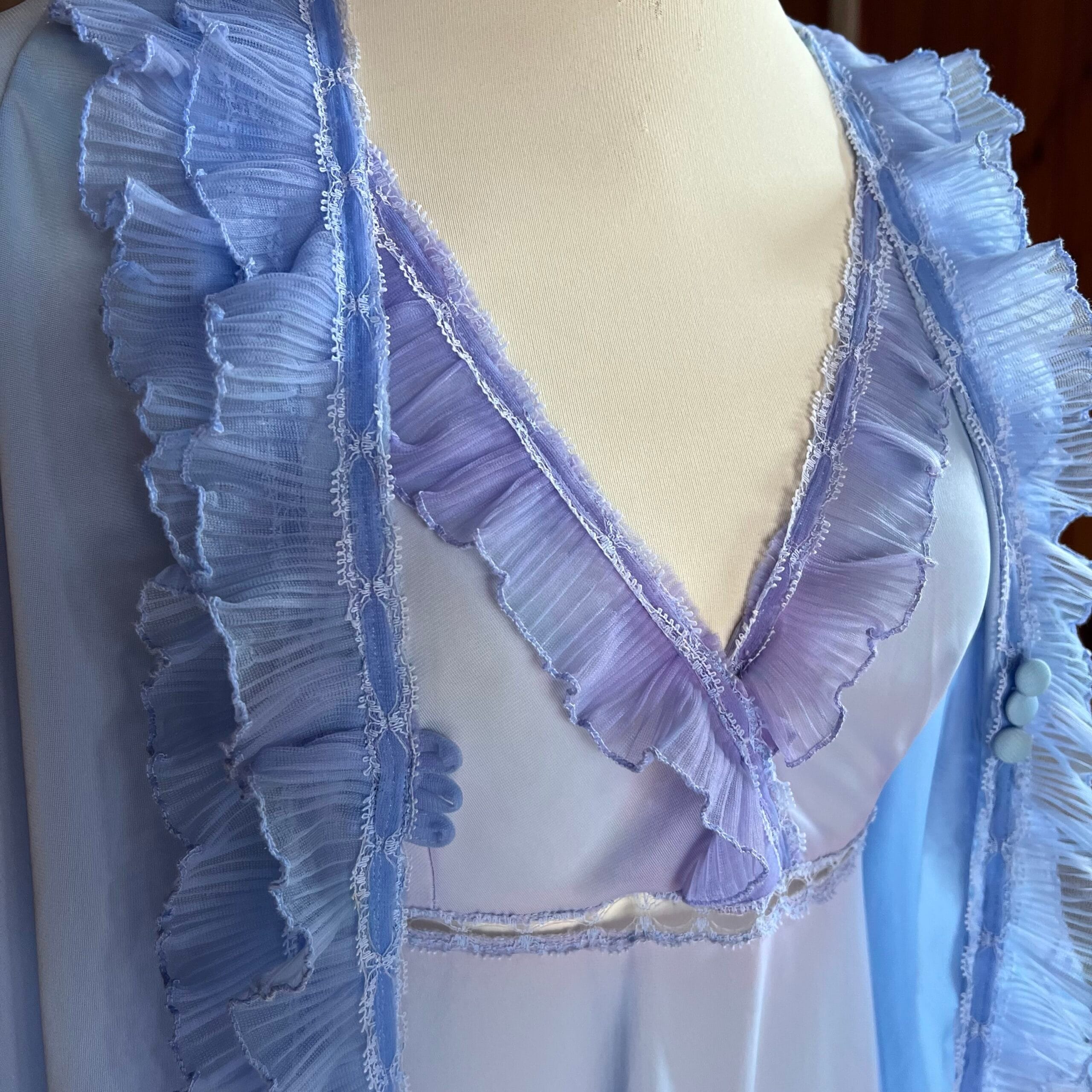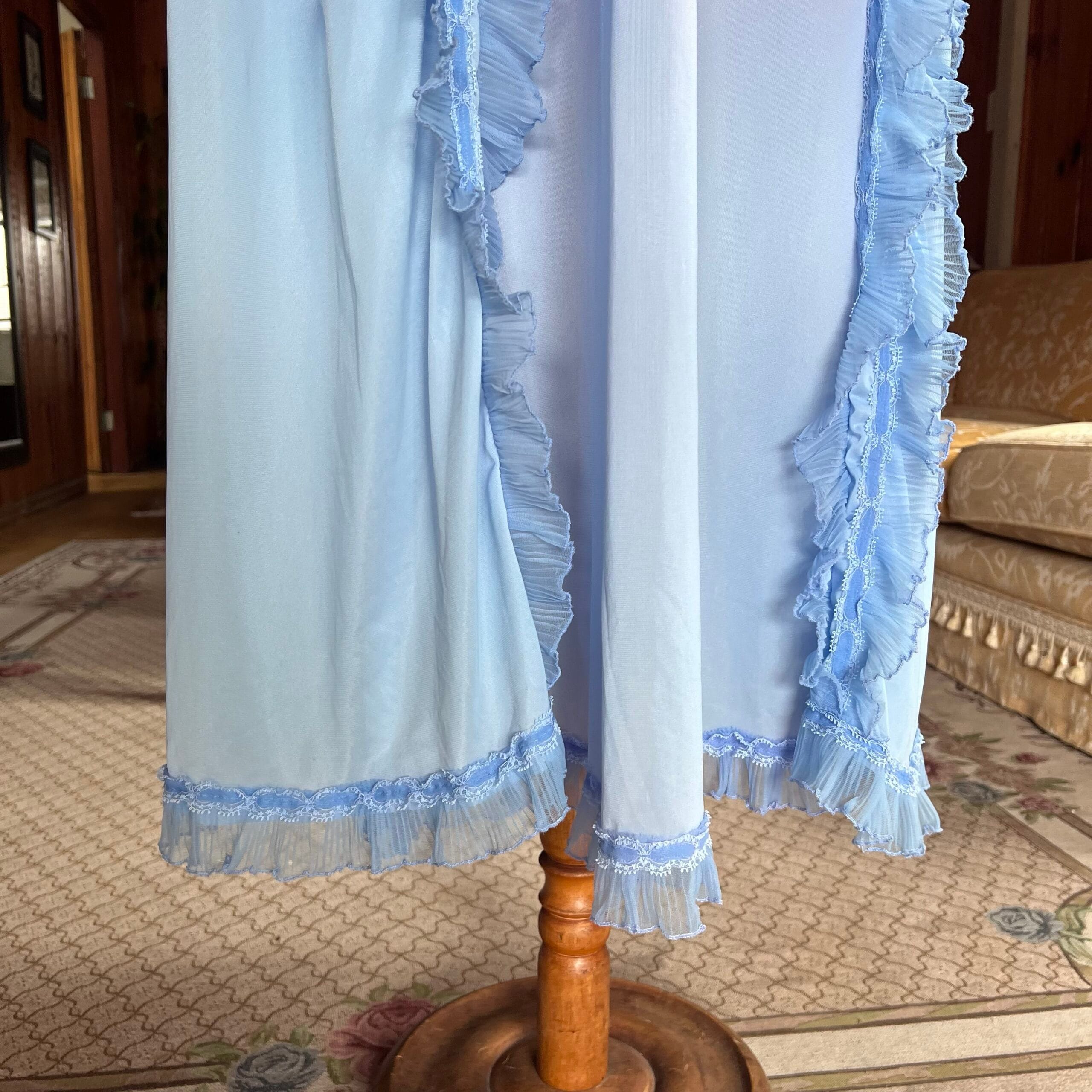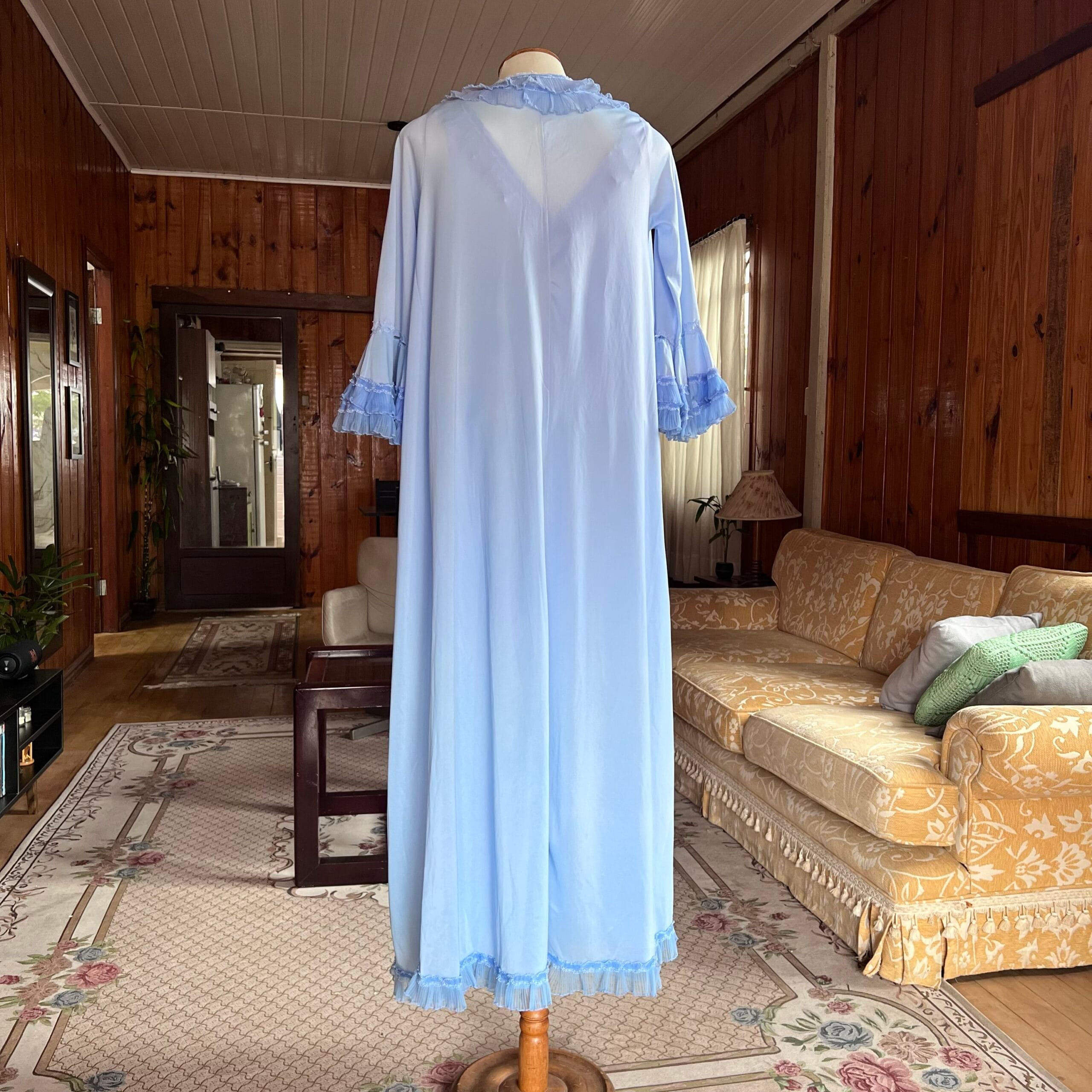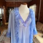 Camisola e penhoar azuis, tecido acetinado, bem confortável. Possui babadinhos nas bordas, o penhoar tem fechamento com botões na parte da frente. Veste P