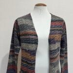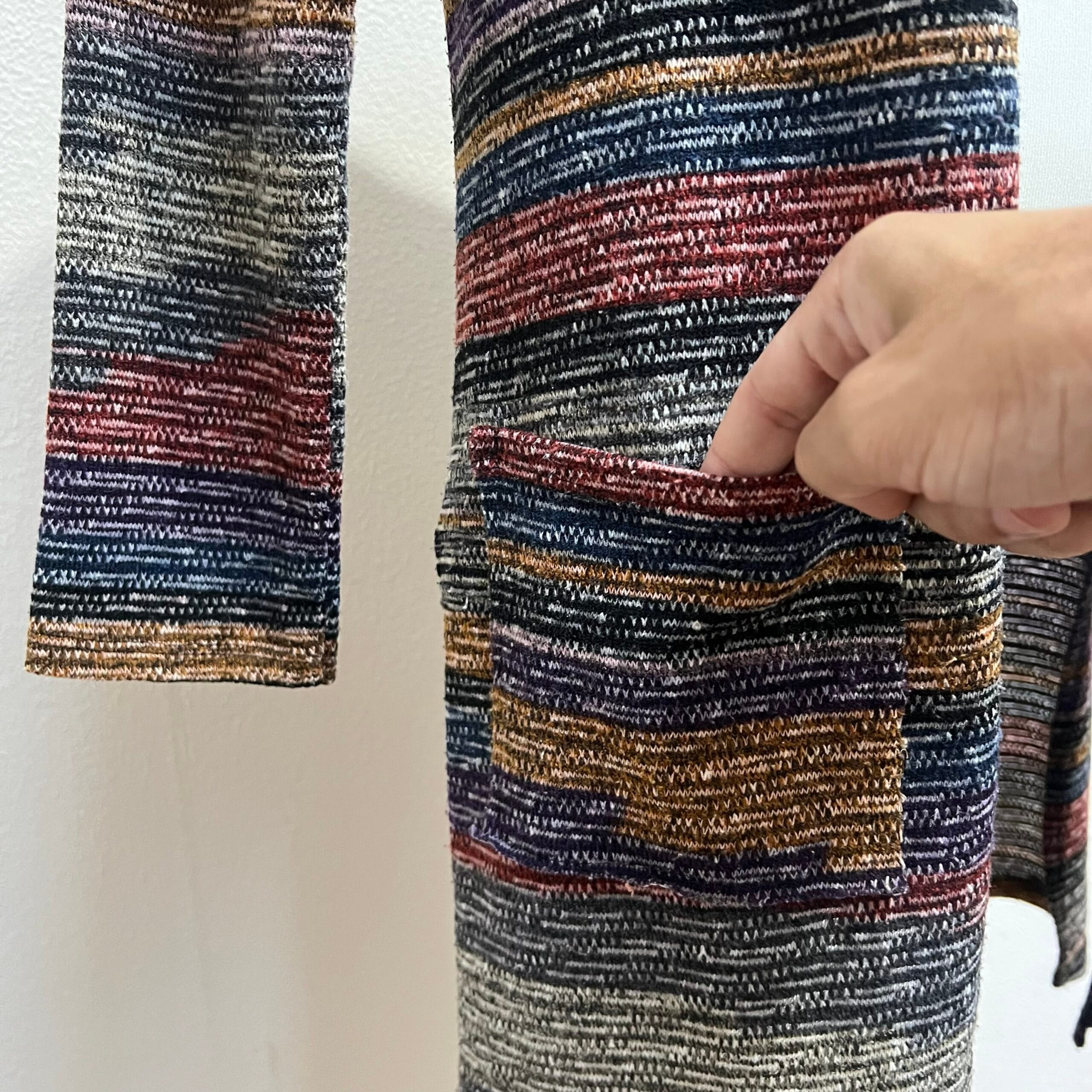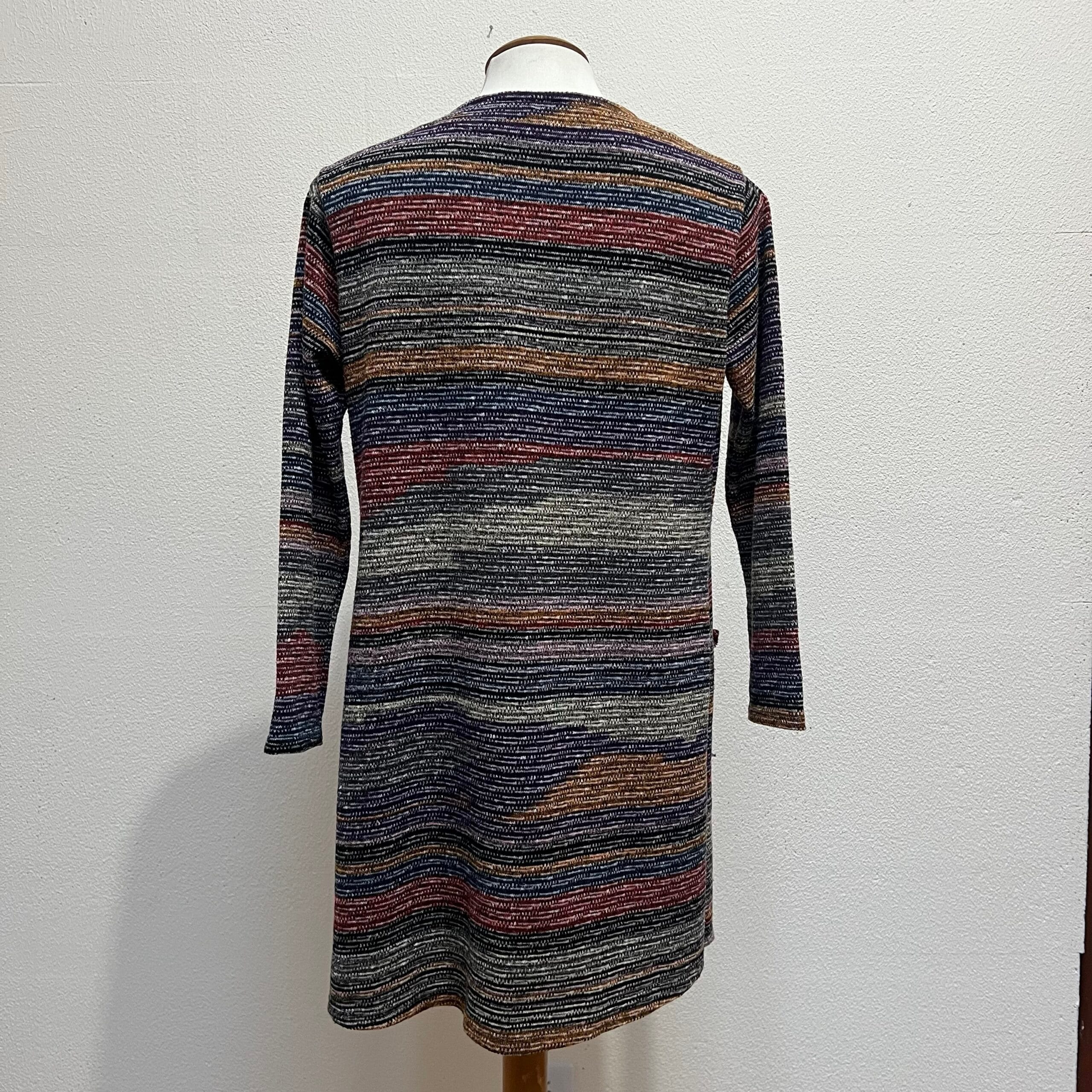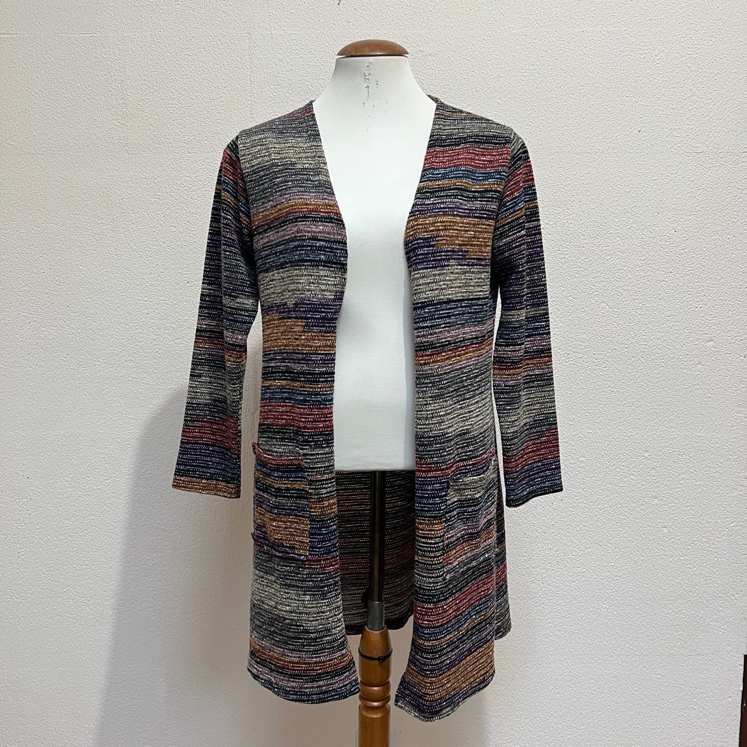 Cardigã longo estilo sobretudo em lã acrílica estampado em listras multicoloridas, com bolsos frontais e mangas 3/4. Veste P