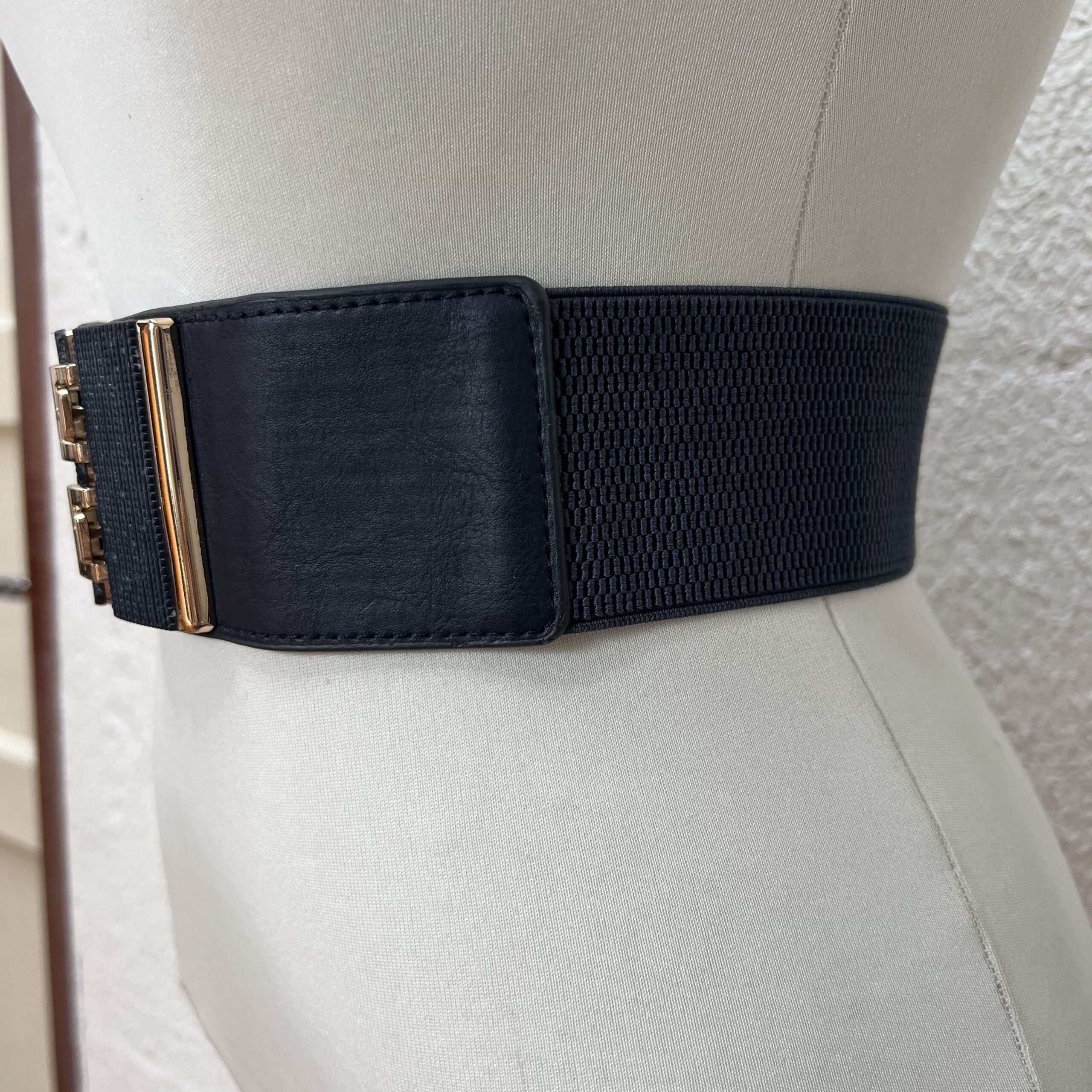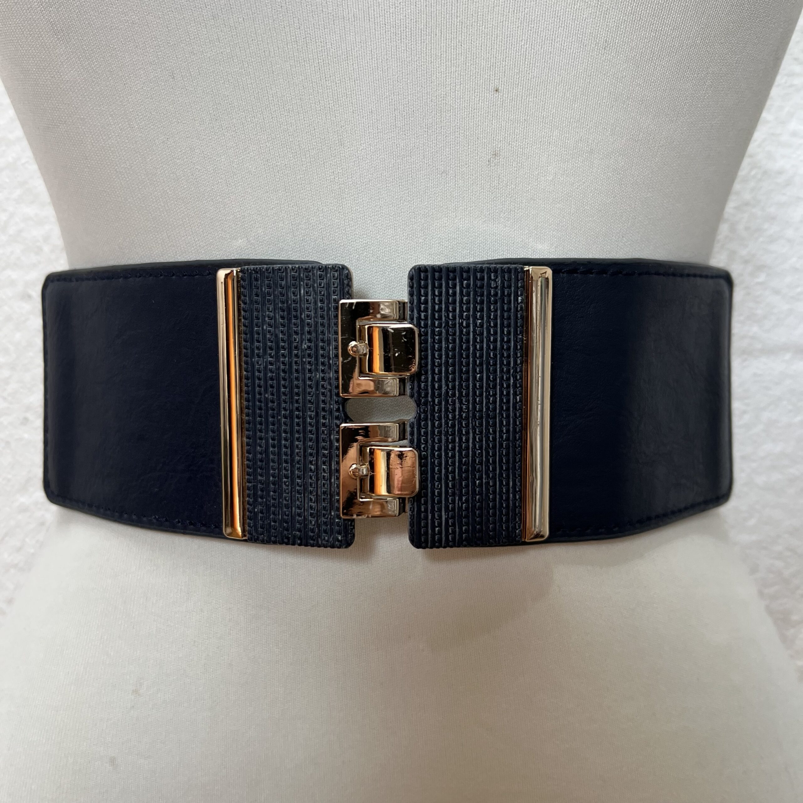 Cinto azul com elástico. Detalhes em alumínio na fivela.