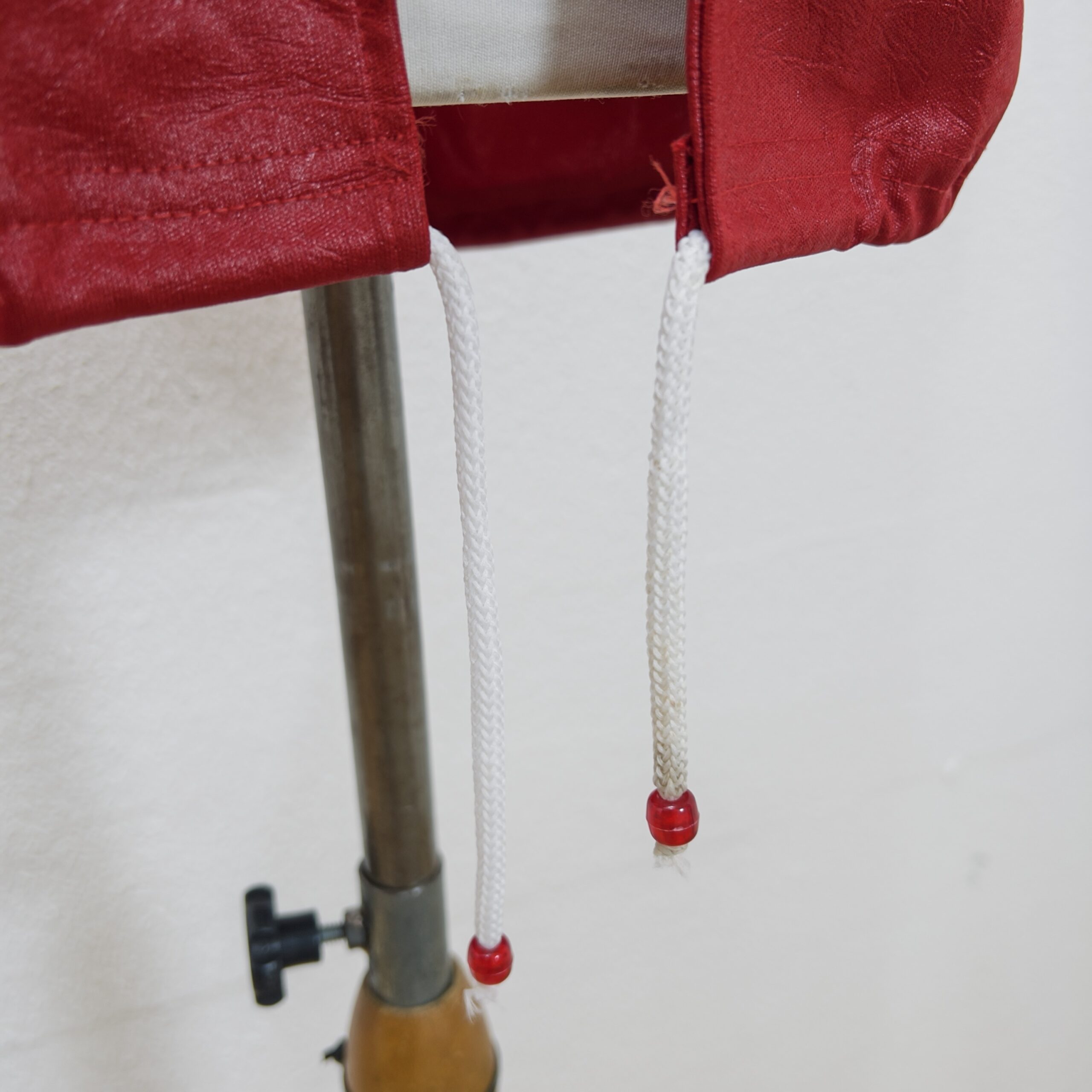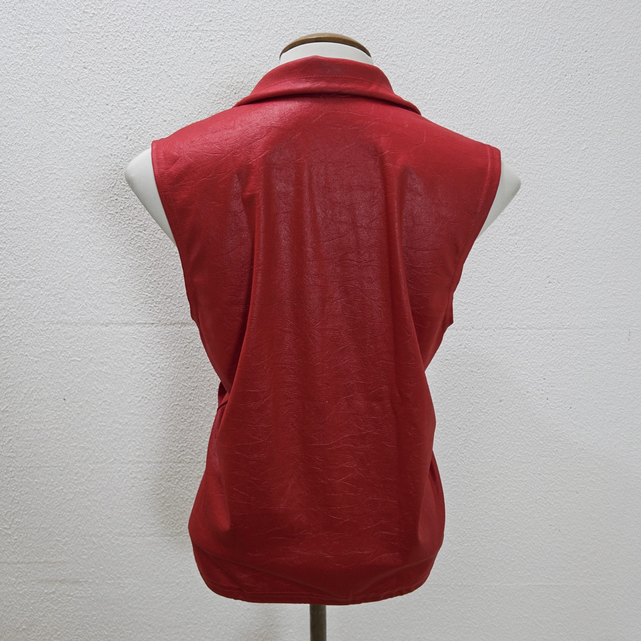 Colete Vintage vermelho em material sintético, sem mangas, com gola e abertura frontal. Possui bolsos frontais e detalhe de cordão no ombro. Peça moderna, ideal para sobreposições e looks despojados. Veste P