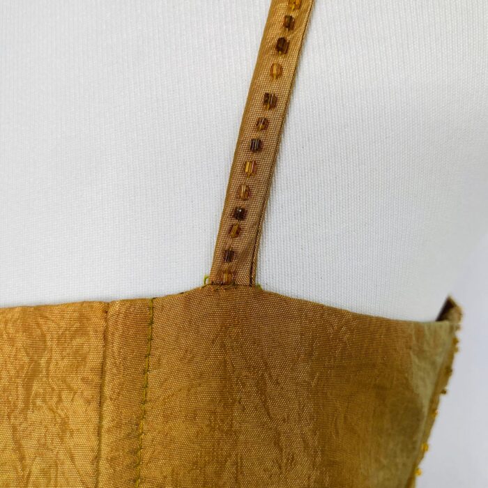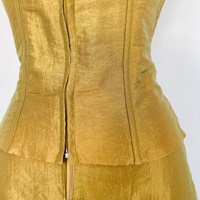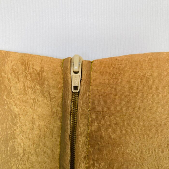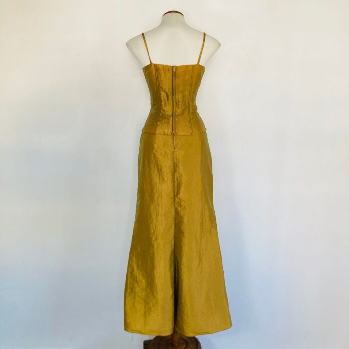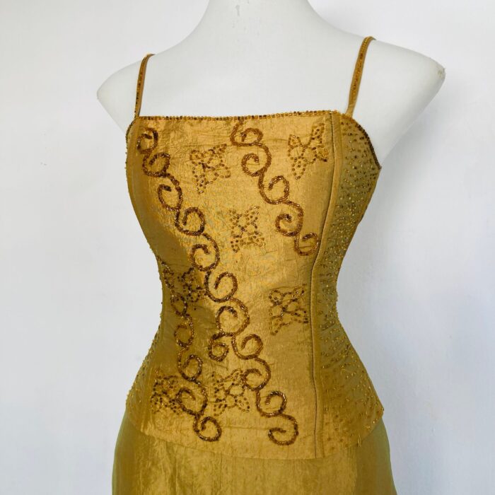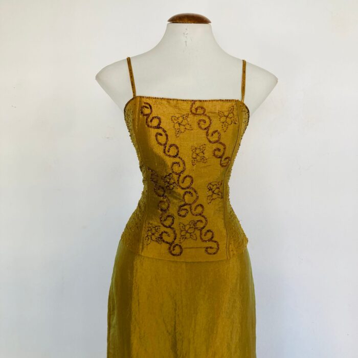 Conjunto em tafetá em tons de verde, bordado com pedrinhas na frente da blusa, anos 80