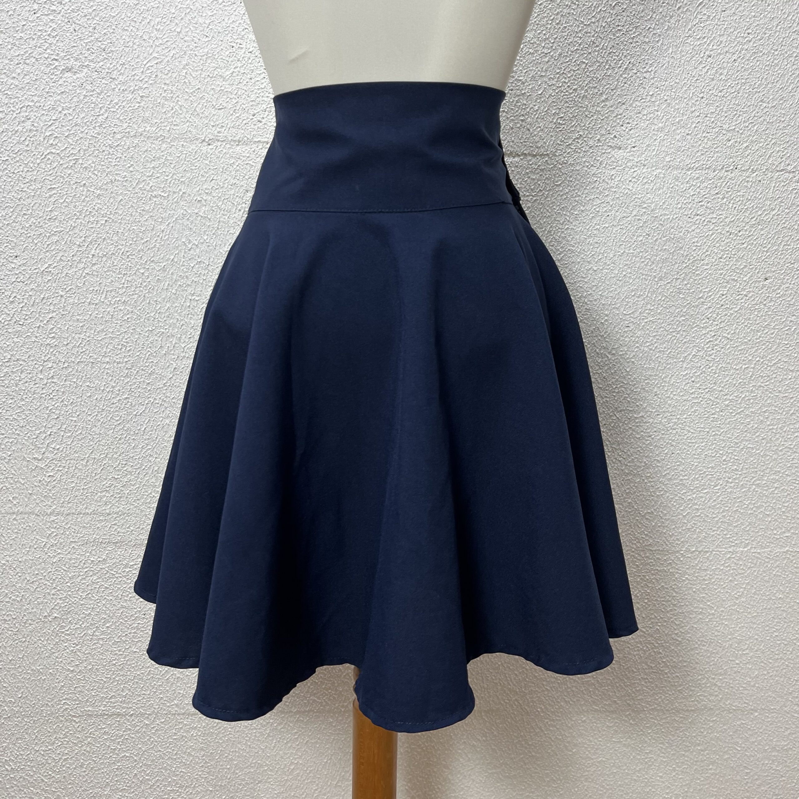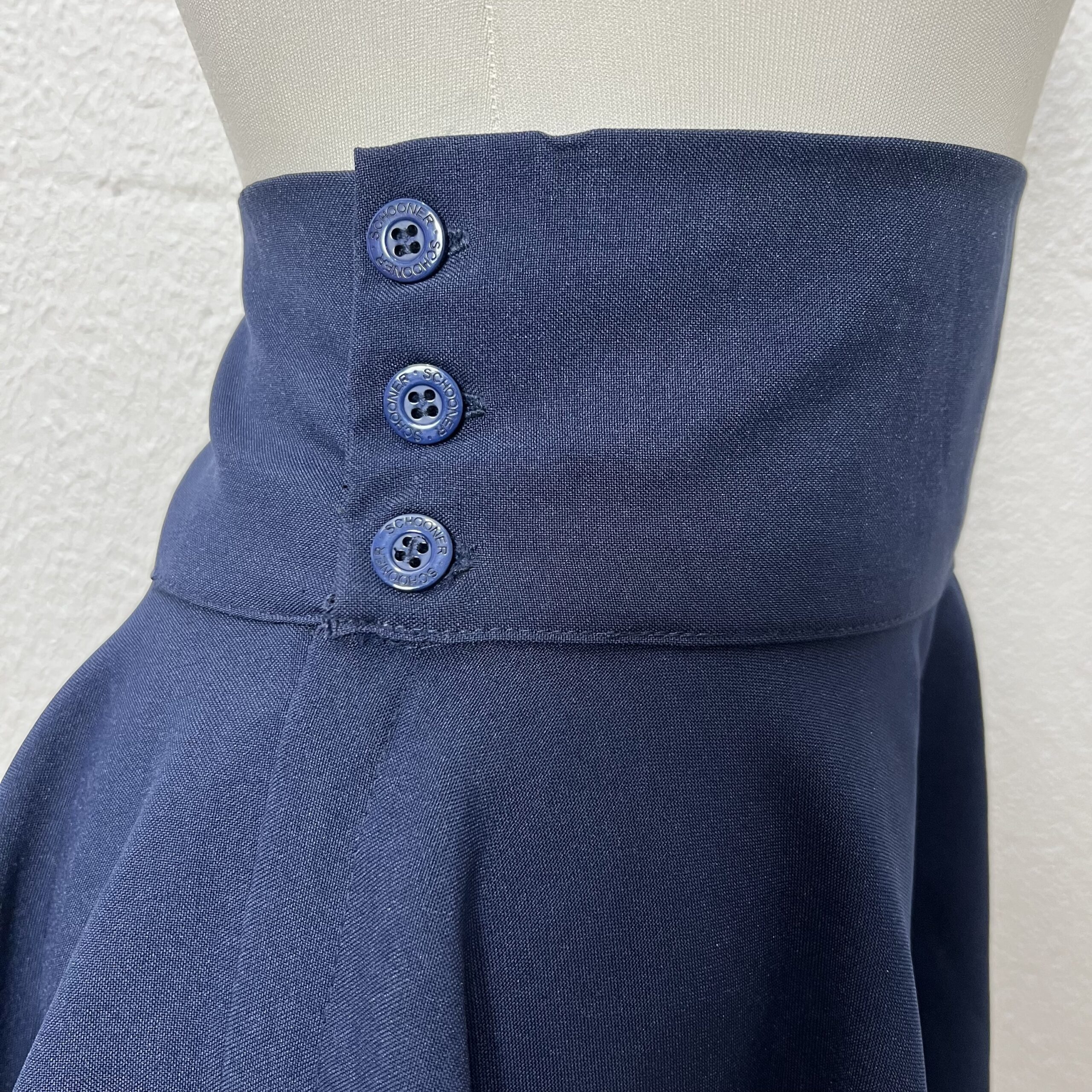 Saia colegial evasê azul em costura caseira, fechamento com botões e zíper na lateral. Veste P