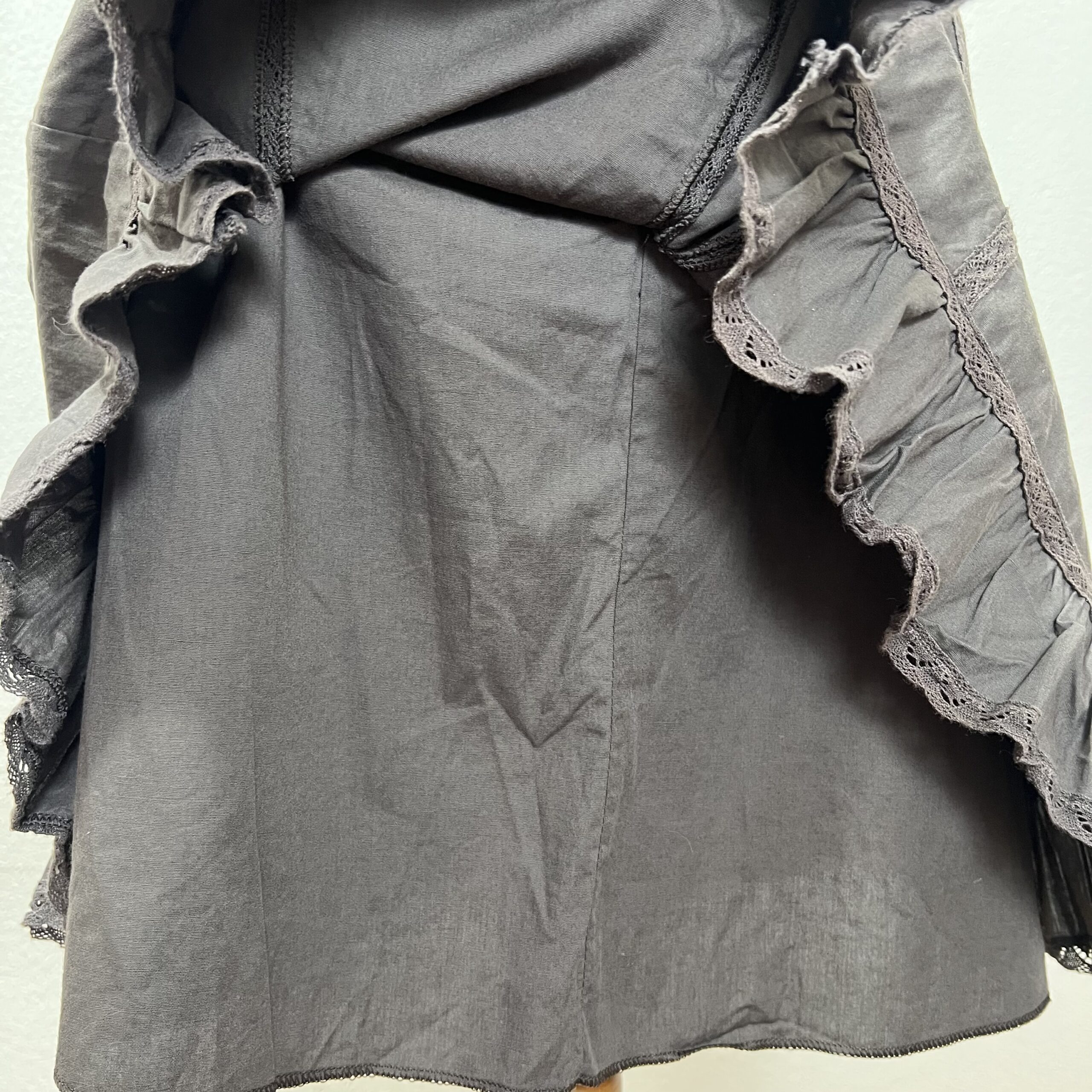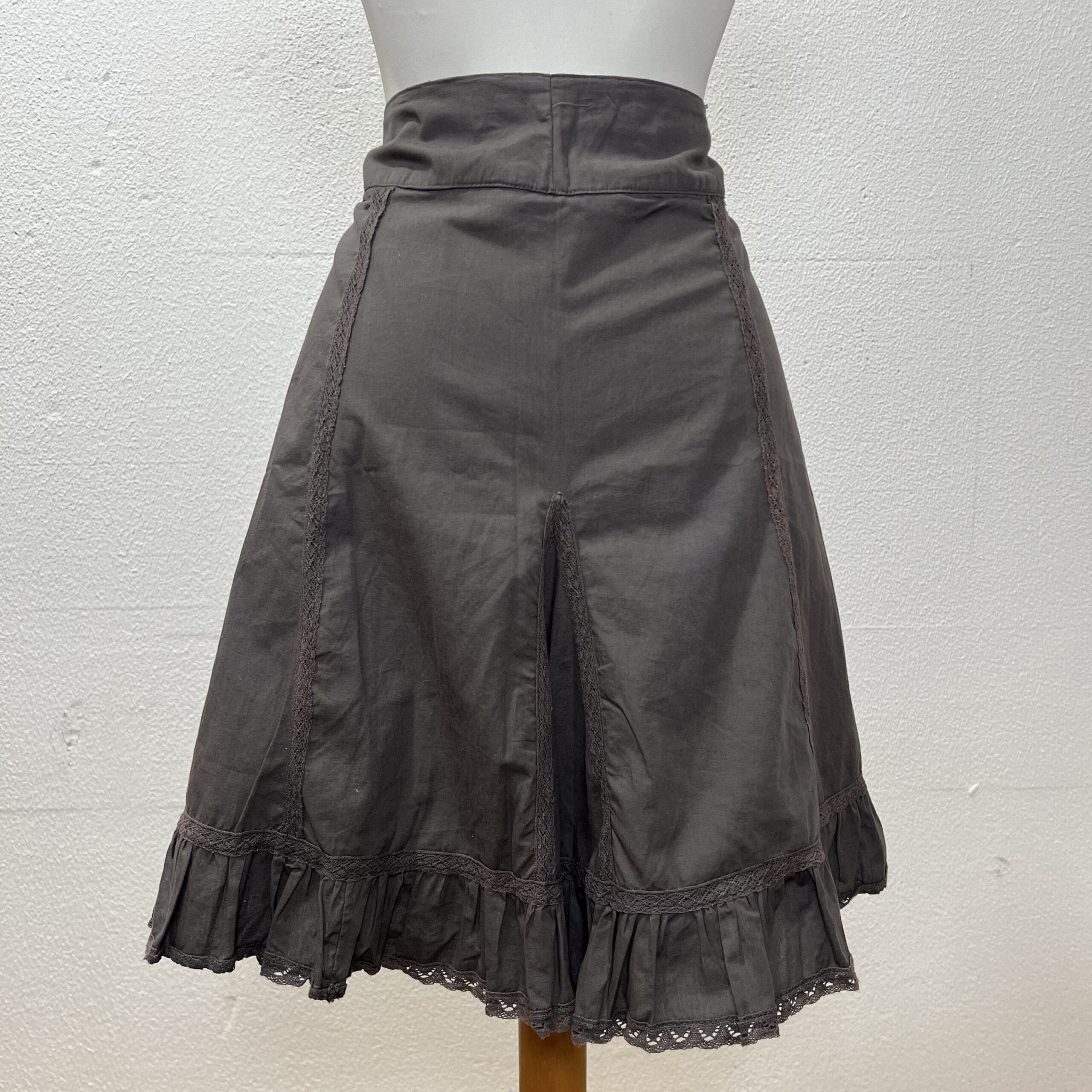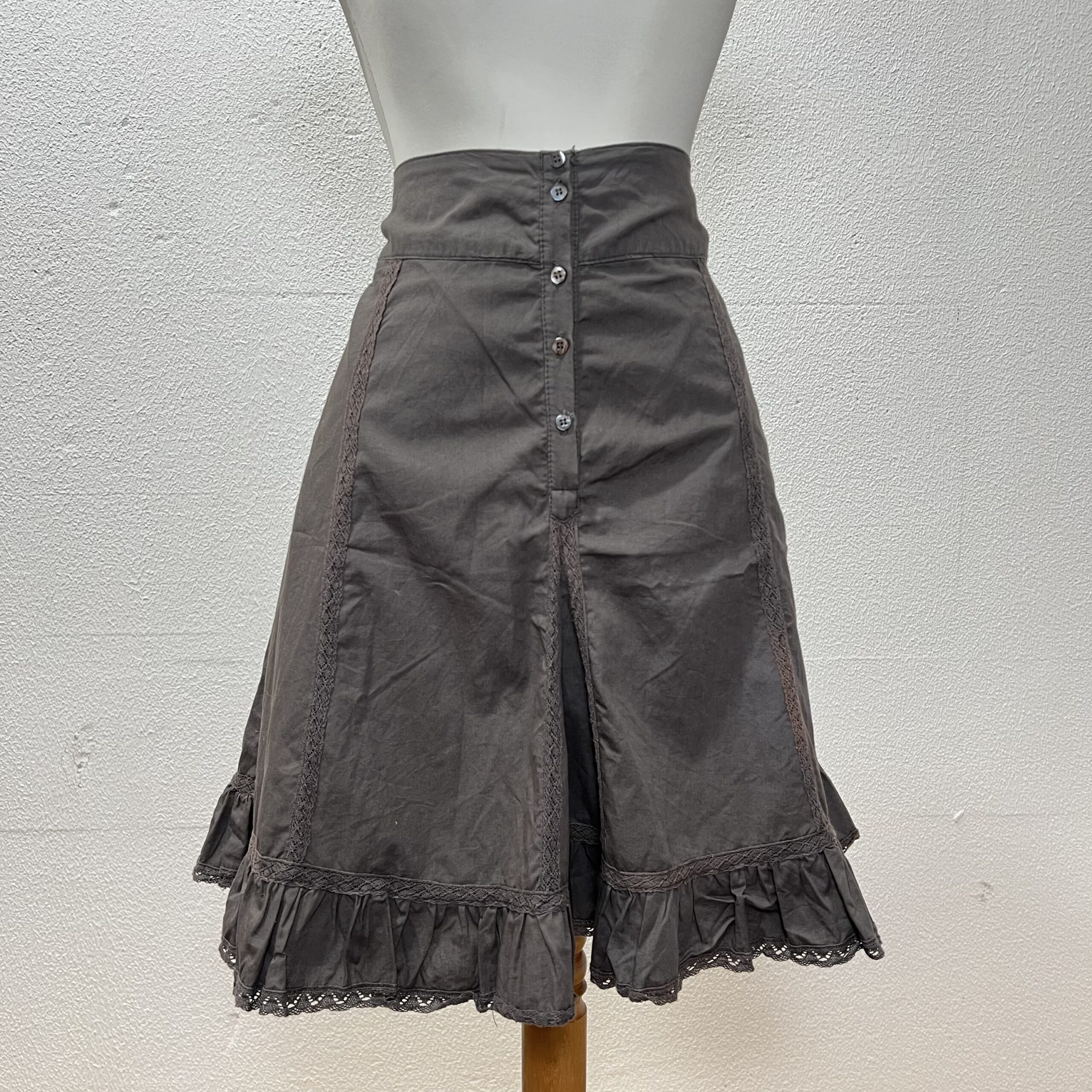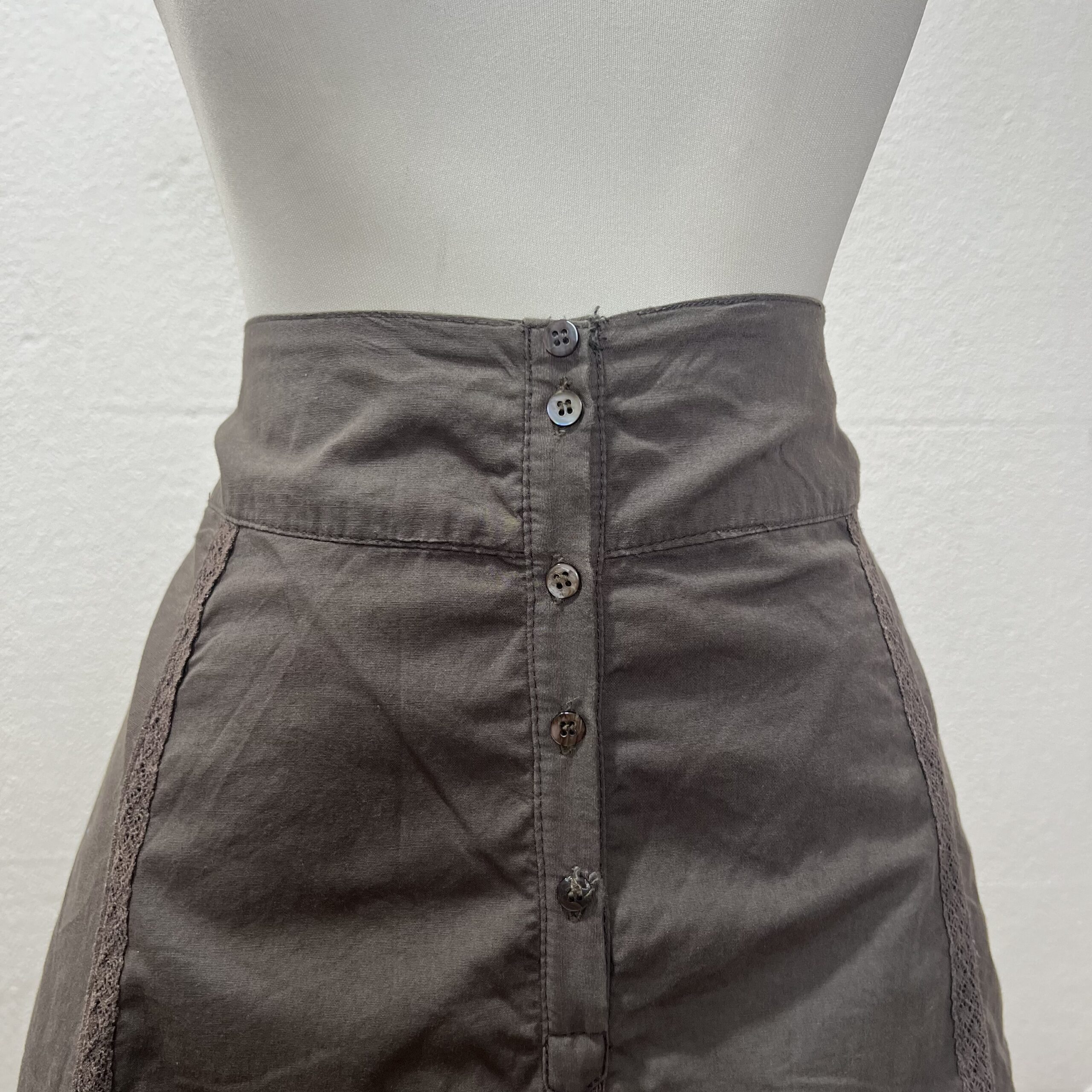 Saia de cintura alta em tecido leve, com fechamento frontal por botões. Possui detalhes em renda nas laterais e barra com babado. Comprimento médio. Veste M