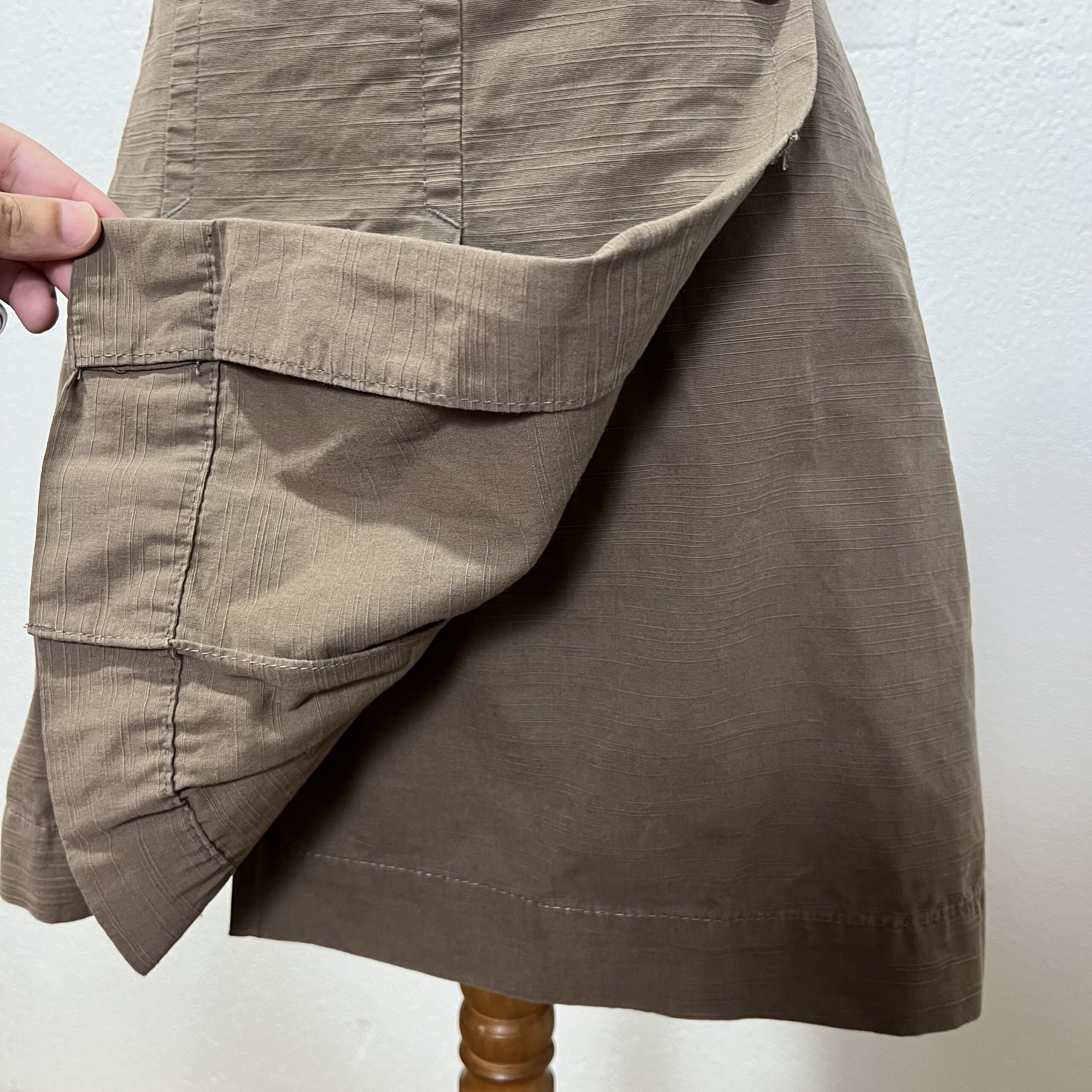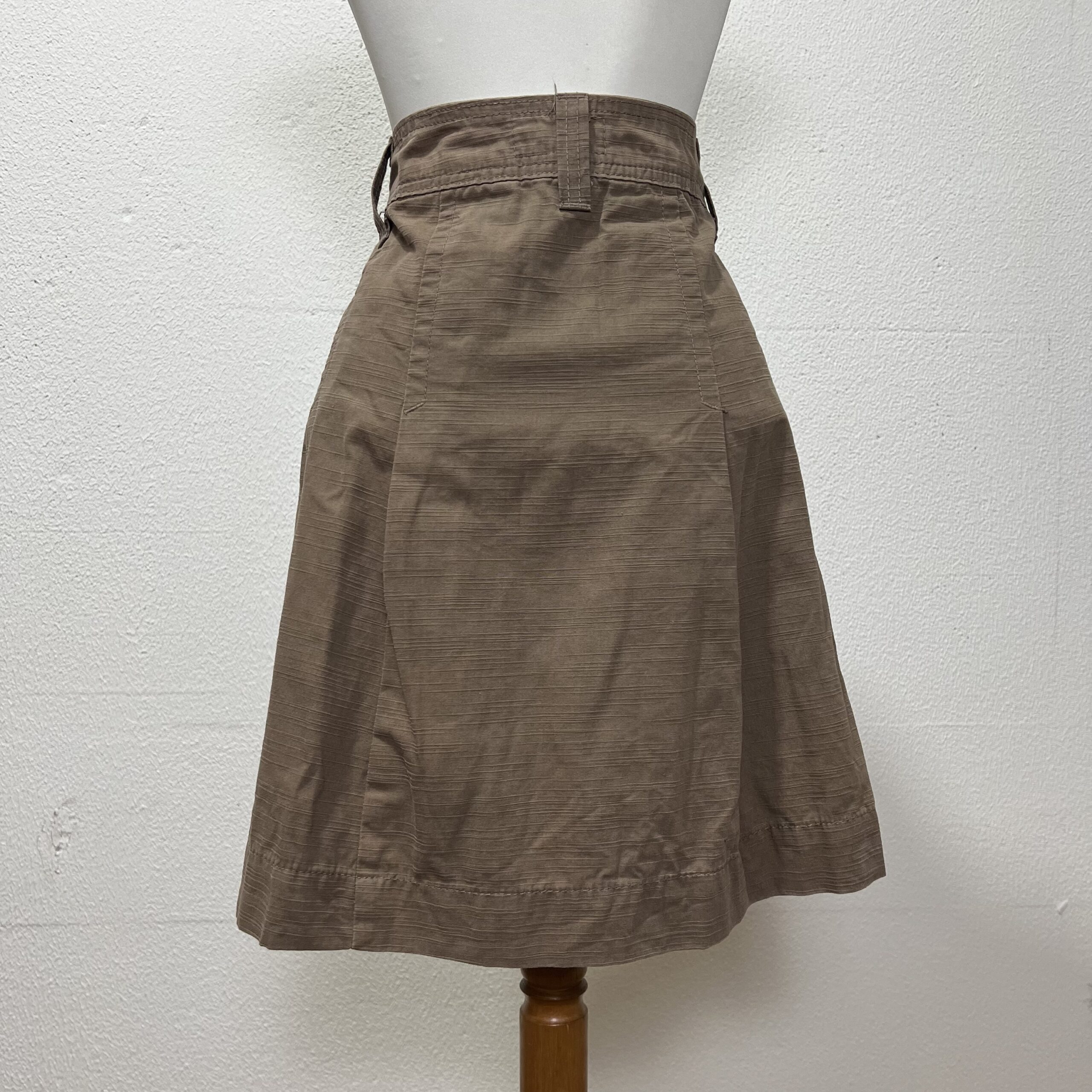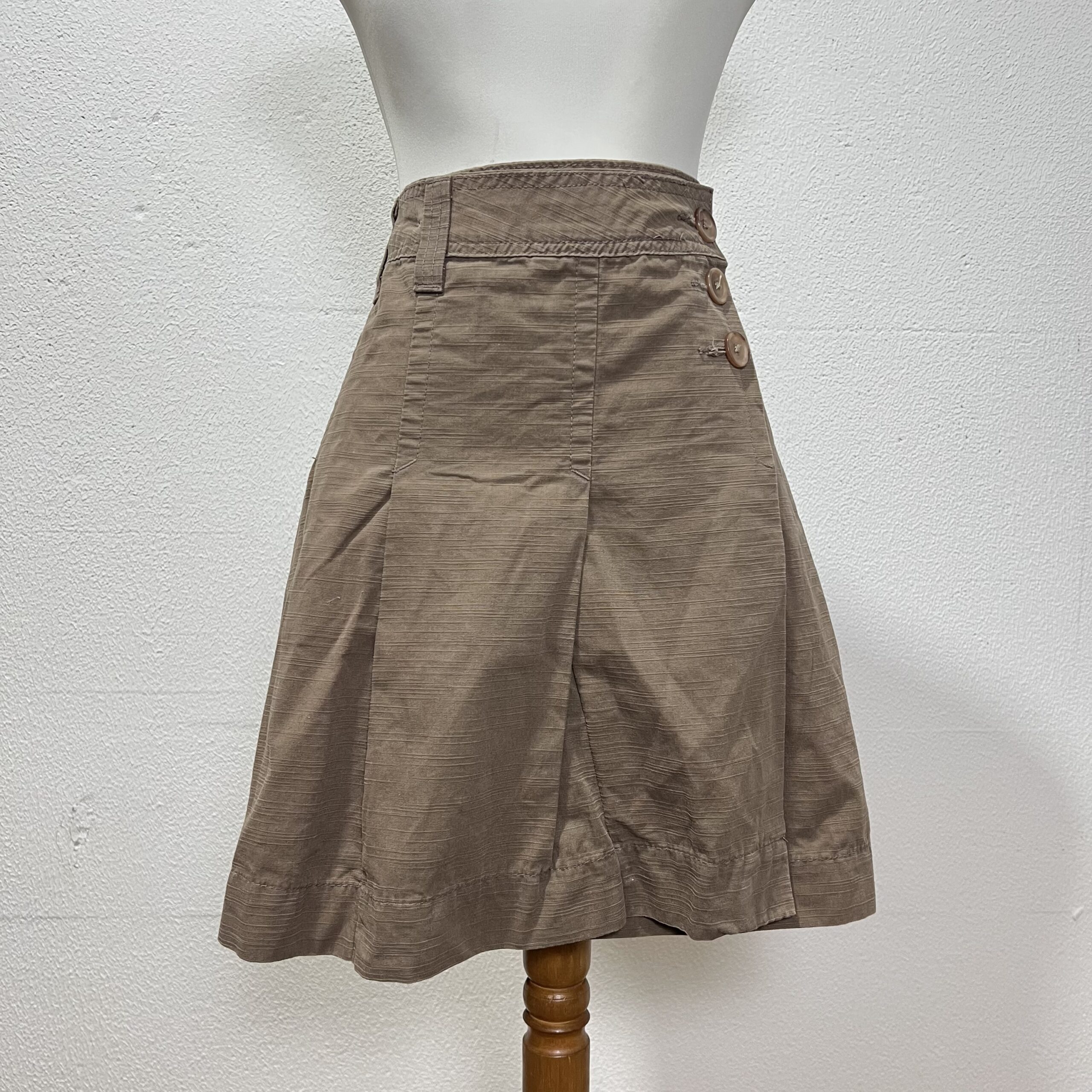 Saia envelope marrom feita em algodão. Possui passadores para cinto e fechamento com botões. O comprimento é acima dos joelhos. Veste M/G