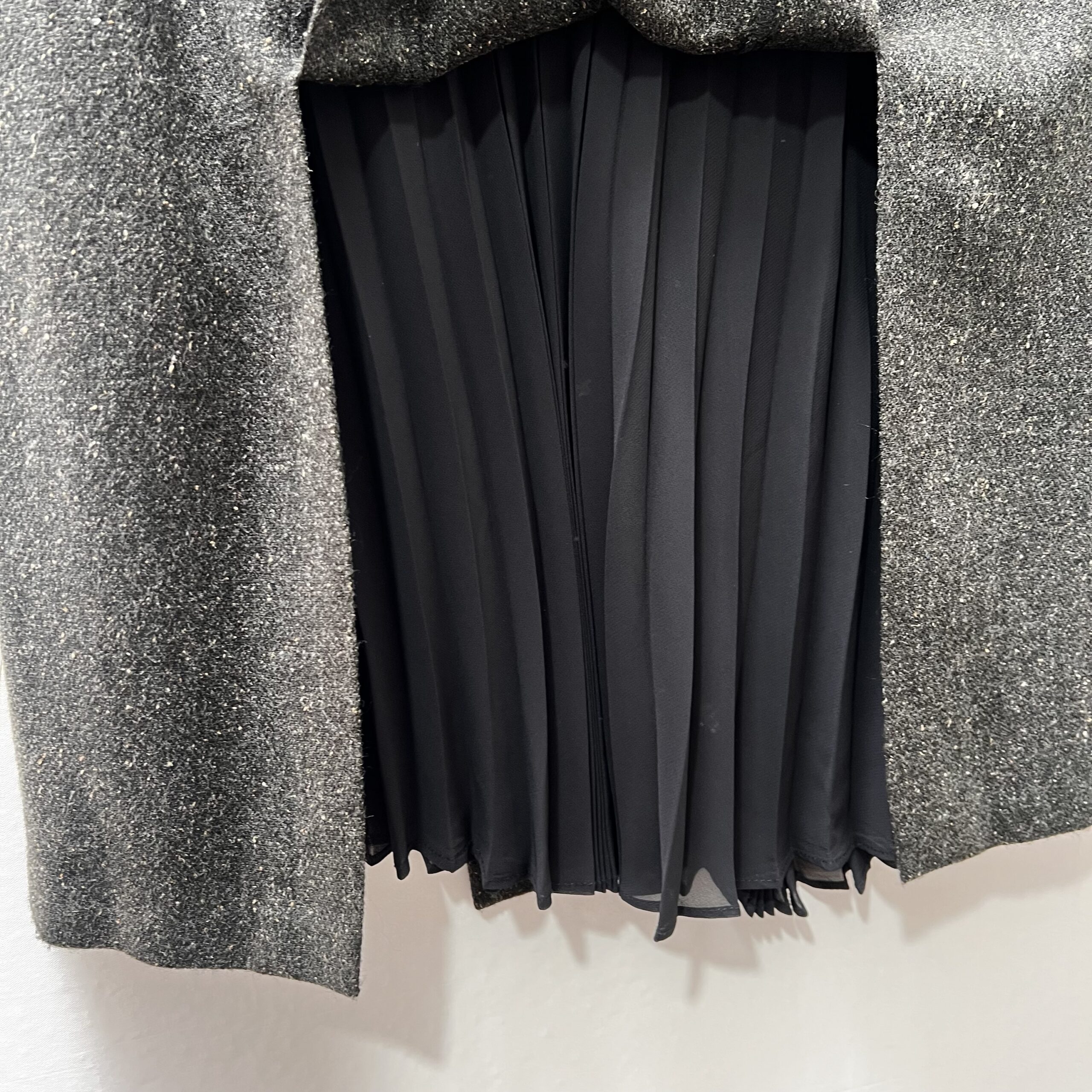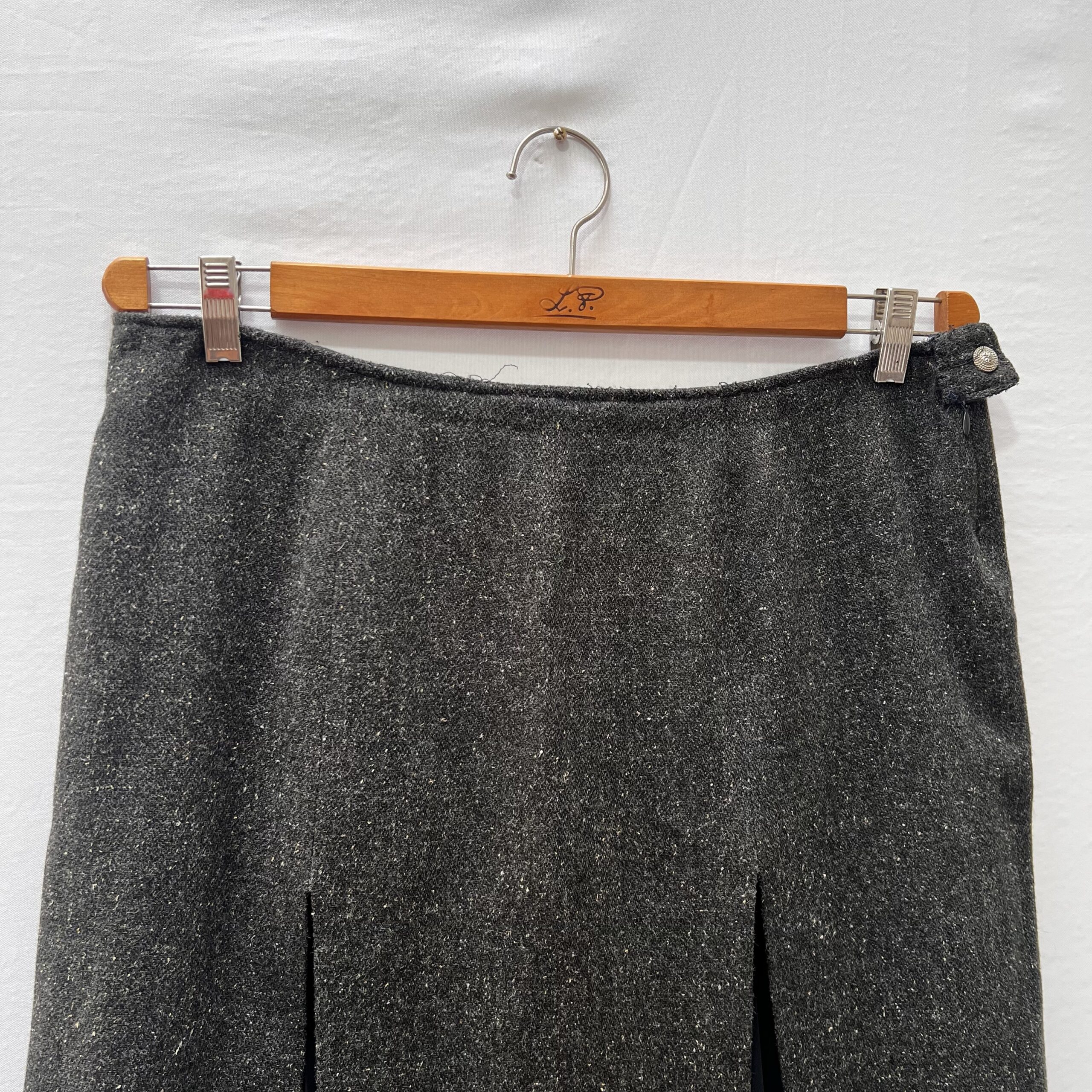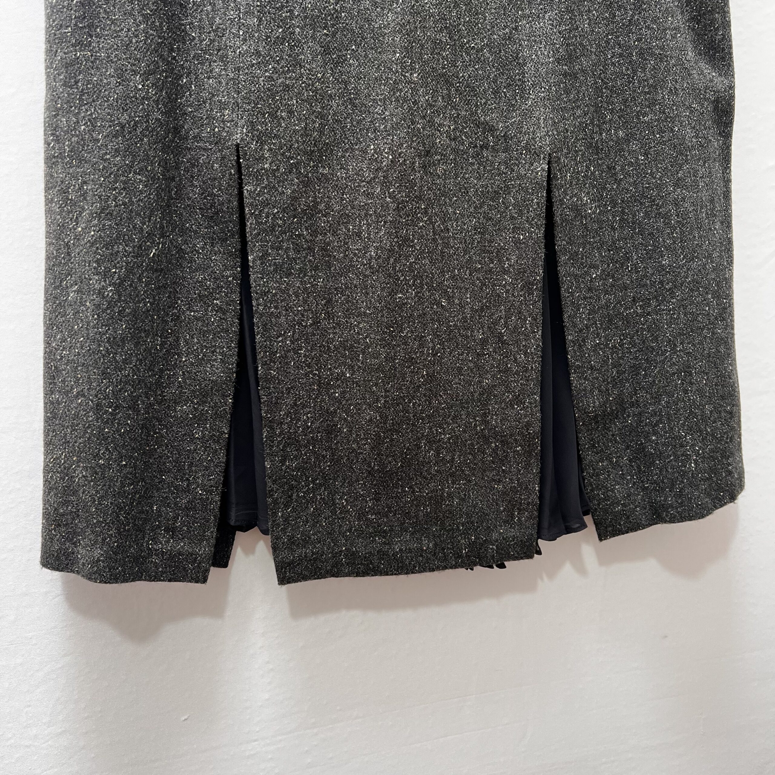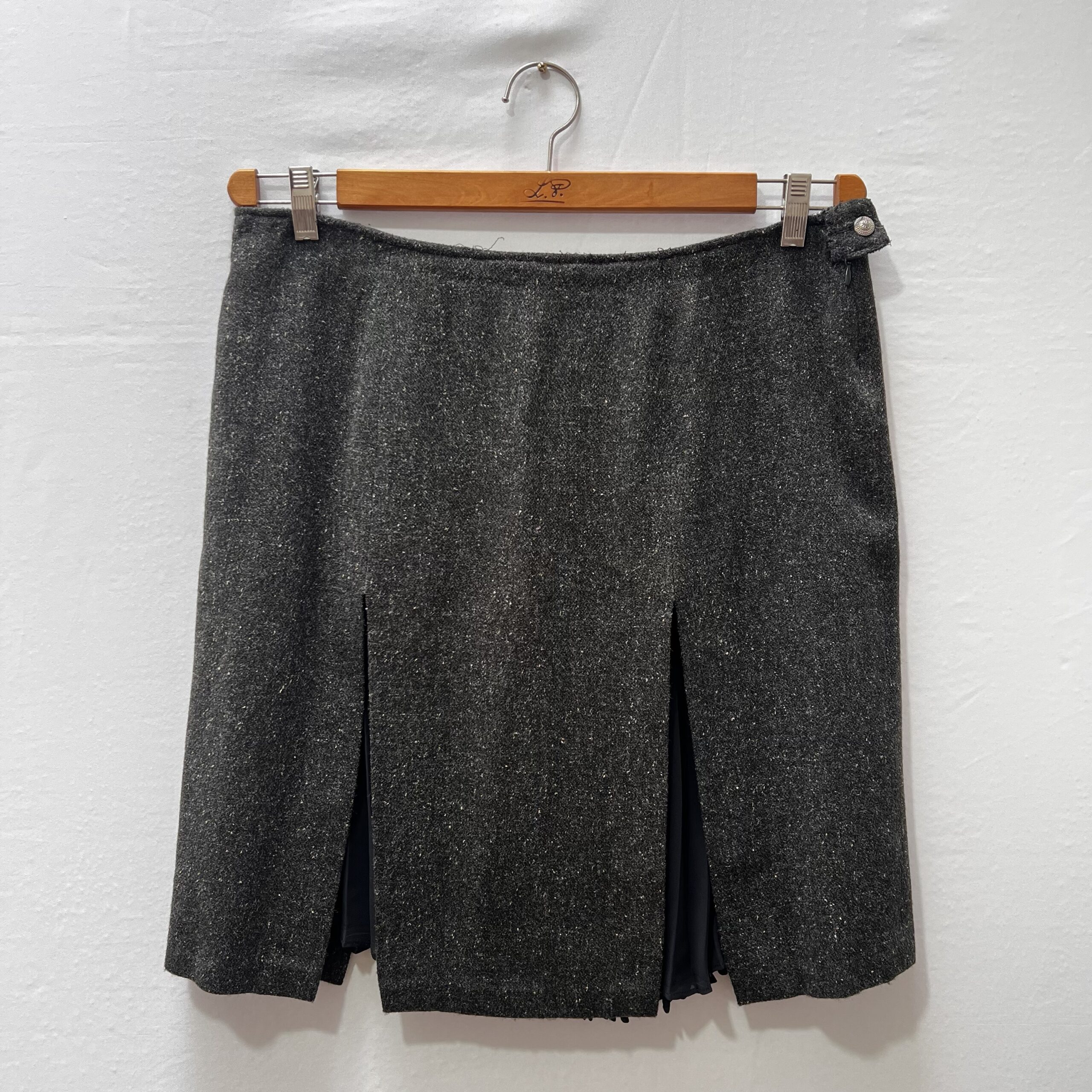 Modelo de cintura média, com fechamento lateral por botão. Possui recortes frontais com fendas e detalhe interno em tecido liso. Comprimento acima do joelho. Veste G.