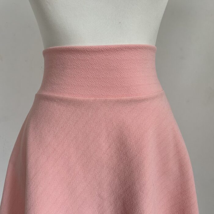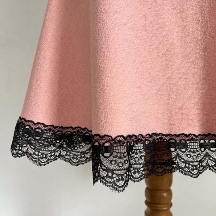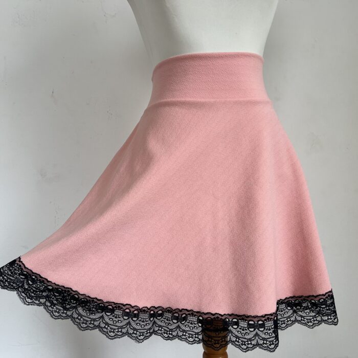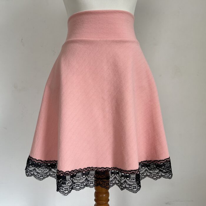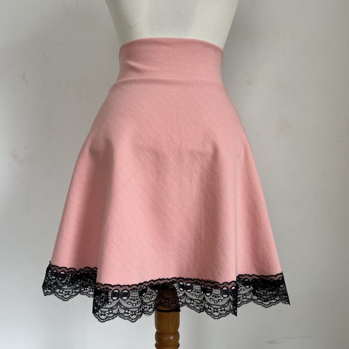 Saia Rosa com rendas na barra em poliéster e elastano. Cintura alta, veste P.