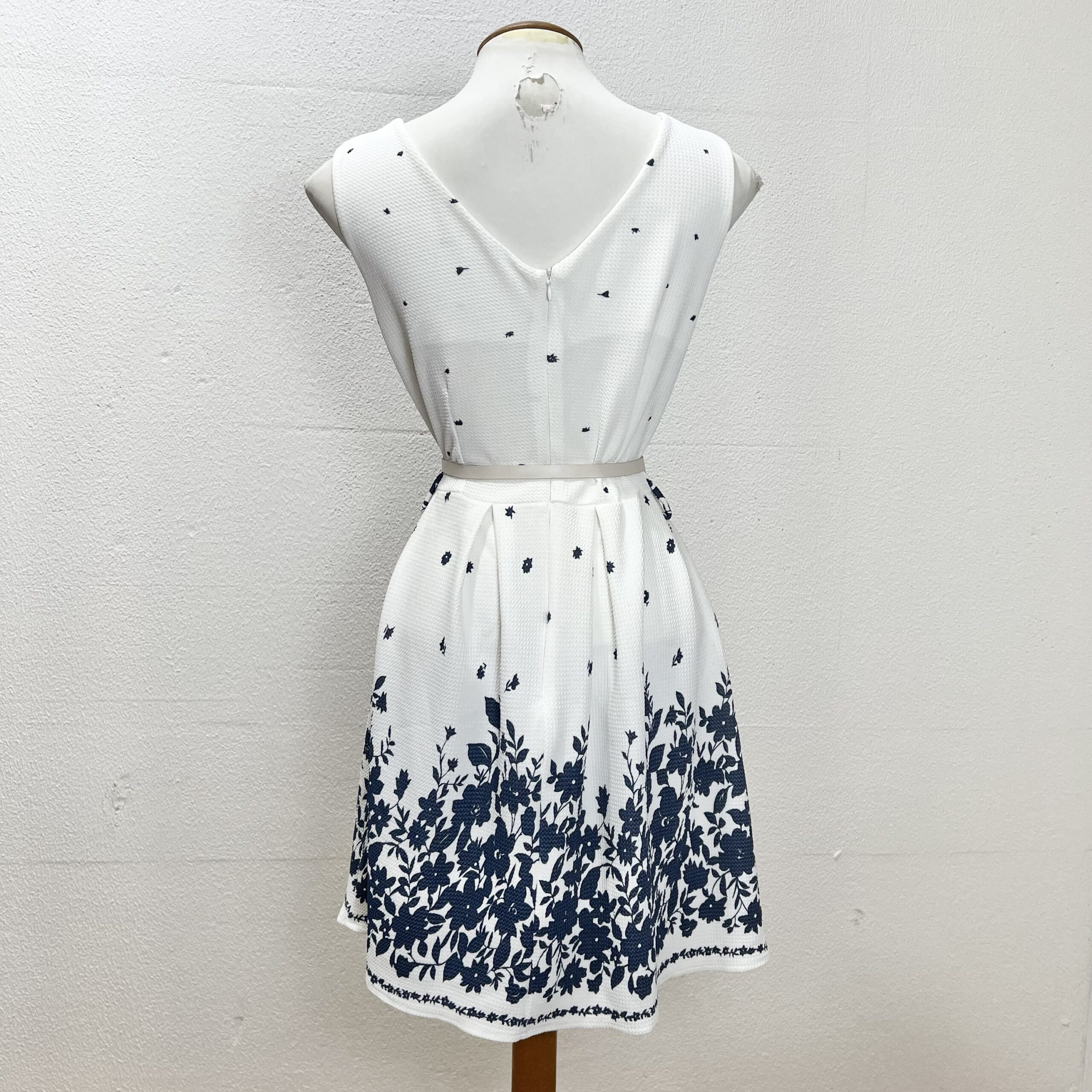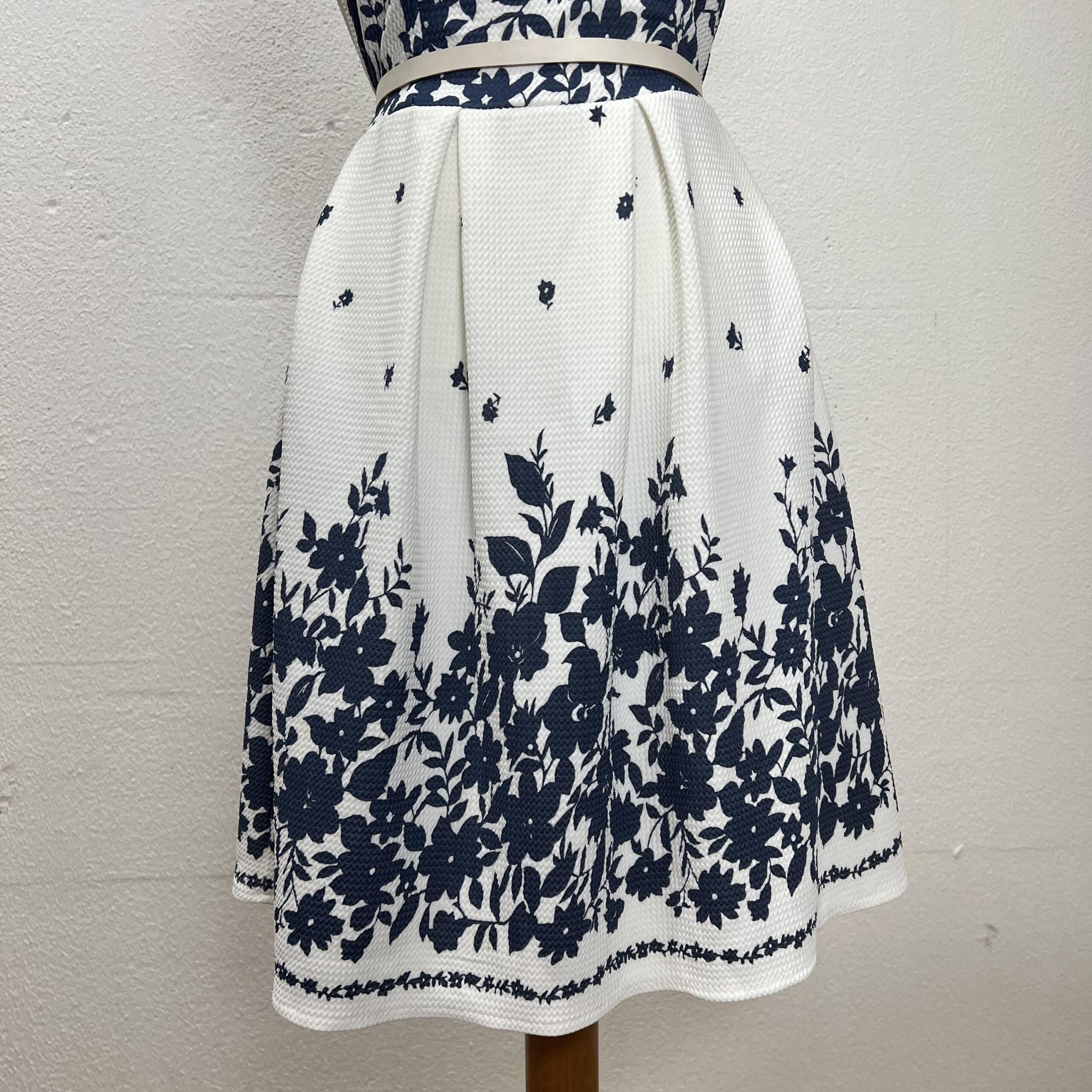 Vestido feito na Itália, confeccionado em poliéster com elastano. Possui modelagem acinturada, sem mangas, com saia evasê e pregas suaves. A estampa floral em azul contrastando com o fundo branco traz um visual elegante e atemporal, enquanto o tecido estruturado oferece conforto e ótimo caimento. Ideal para ocasiões especiais ou produções mais refinadas. Veste PP/P