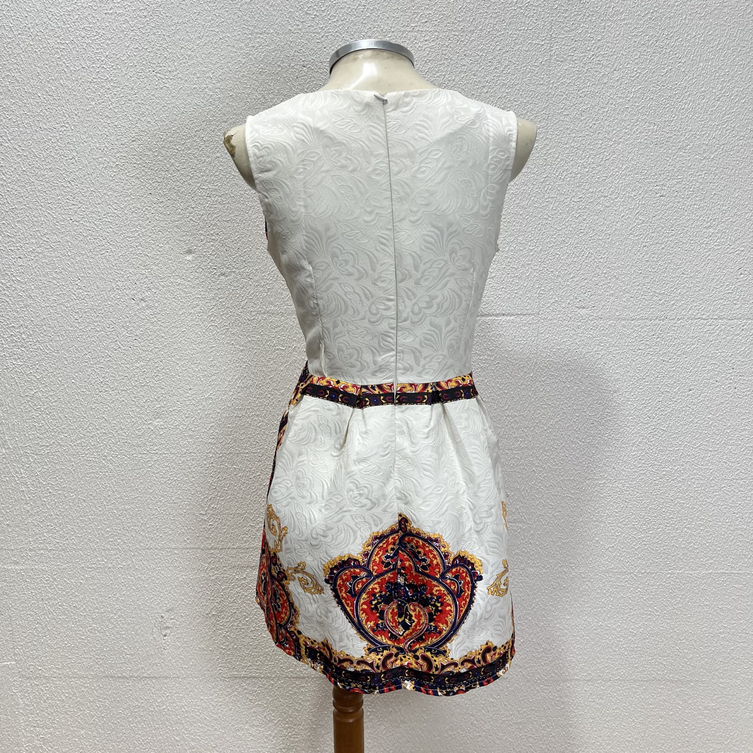 Vestido curto sem mangas, em tecido encorpado com textura em relevo. Possui estampa ornamental em estilo barroco, combinando tons de branco, dourado, vermelho e azul-marinho. Modelagem acinturada, com recorte marcado na cintura e saia levemente rodada. Decote redondo e acabamento refinado, ideal para produções elegantes com um toque vintage. Veste P/M (38/40)