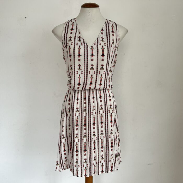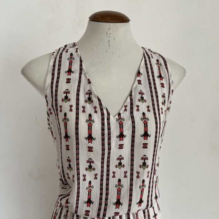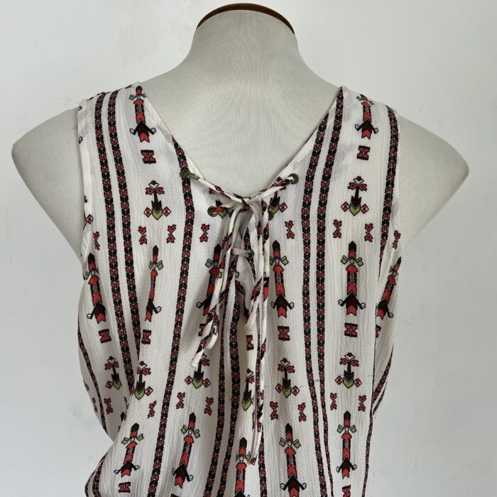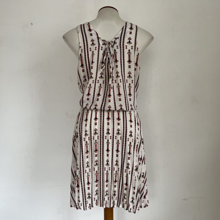 Vestido na cor creme com desenhos geométricos. Feito em poliéster, sem mangas, soltinho na parte do busto e forrado da cintura para baixo. Possui ajuste com cordão na parte das costas. Veste P/M