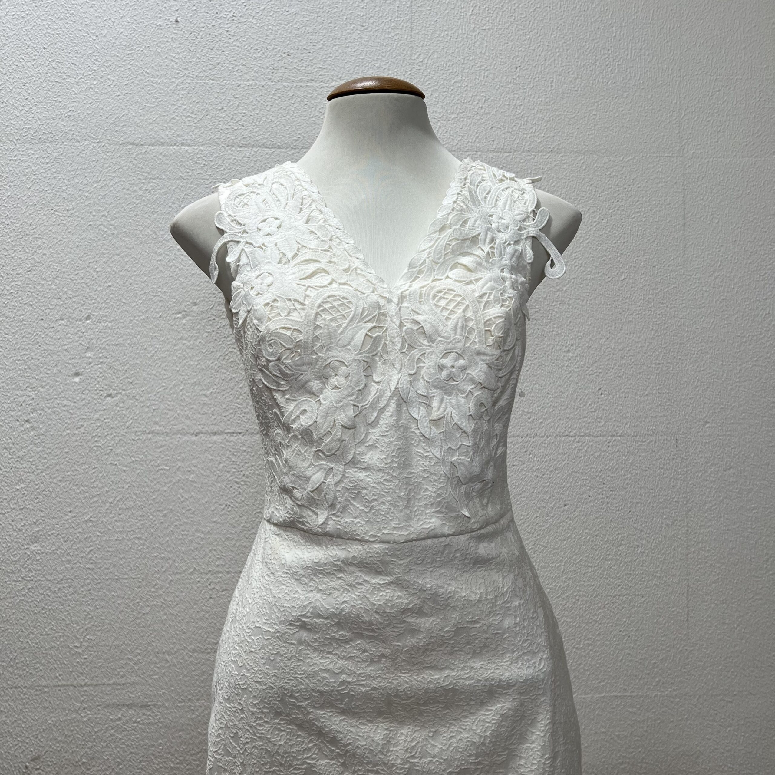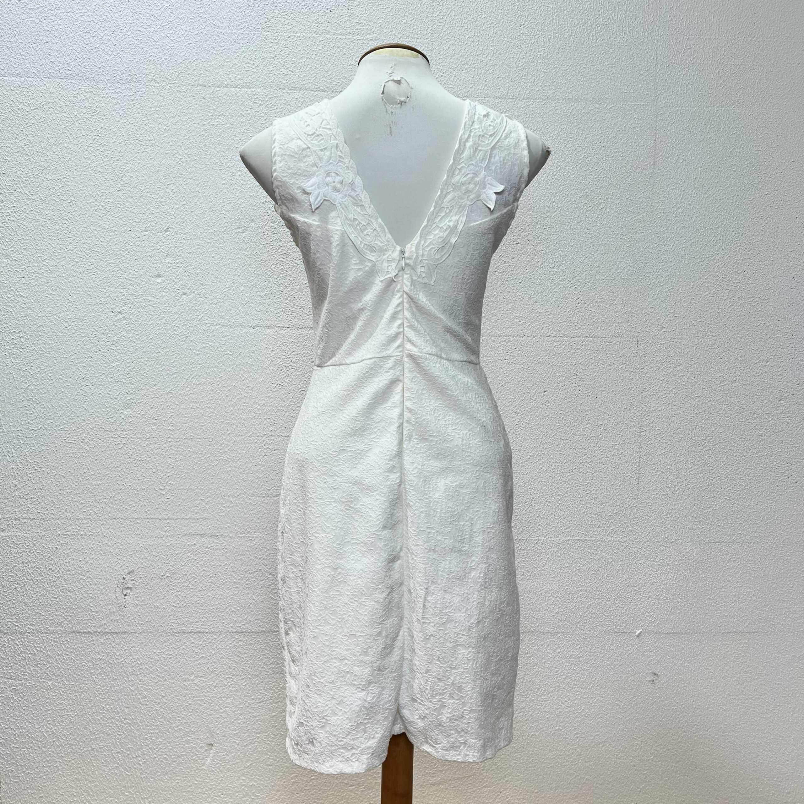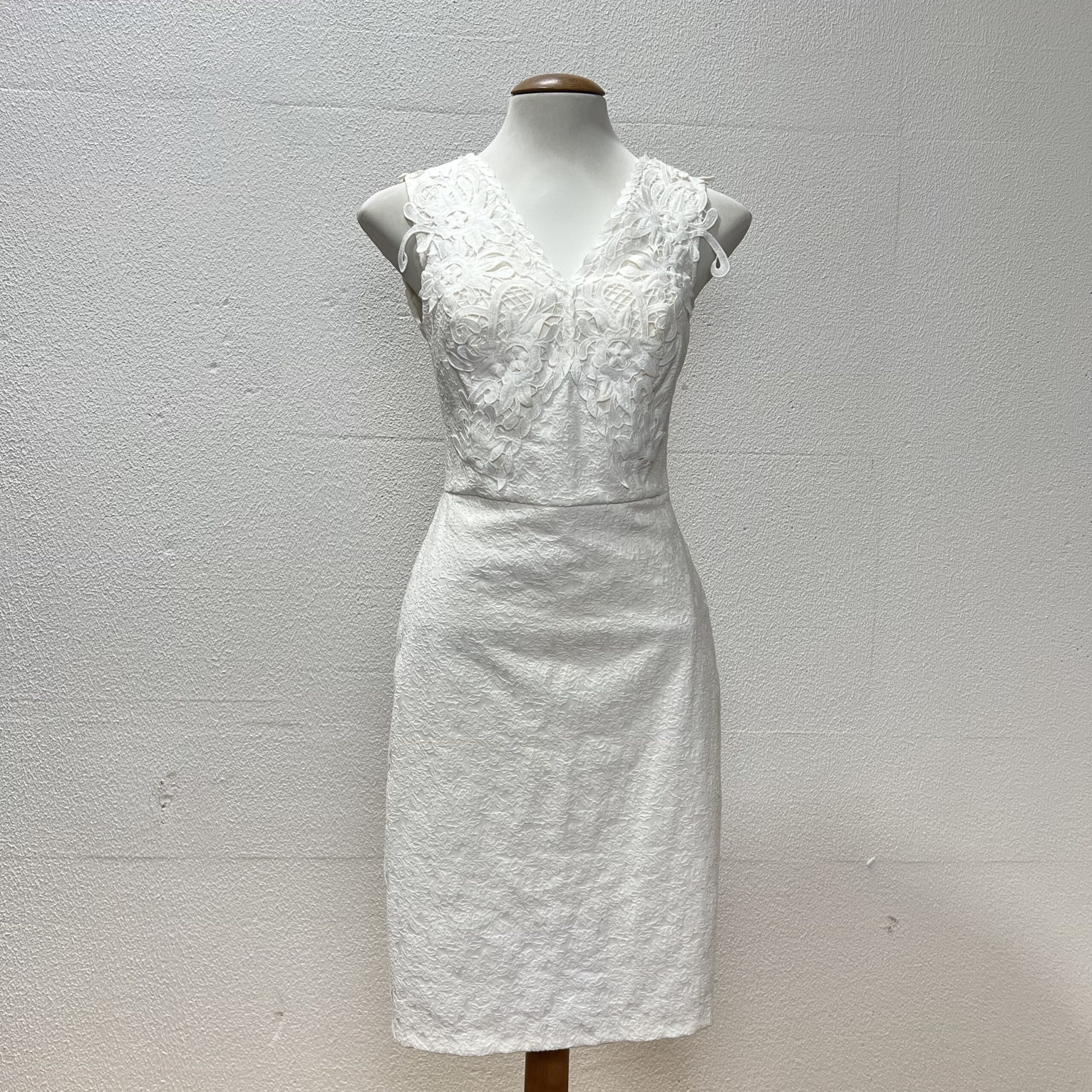 Vestido de noiva curto branco sem mangas, com decote em V. Parte superior em renda com aplicação floral e saia reta em tecido texturizado, fechamento com zíper na parte traseira. Comprimento midi. Veste
