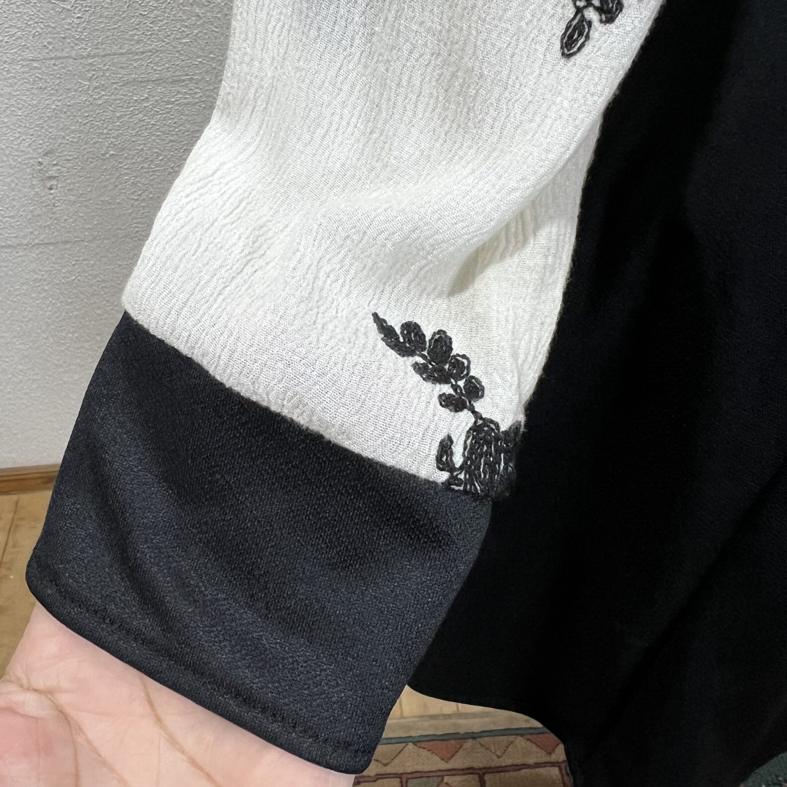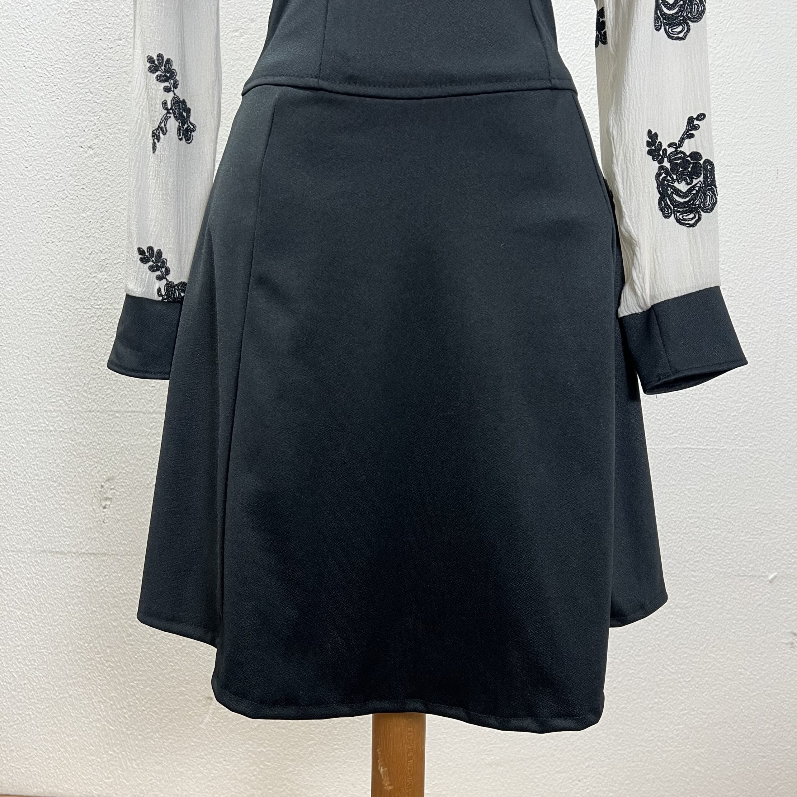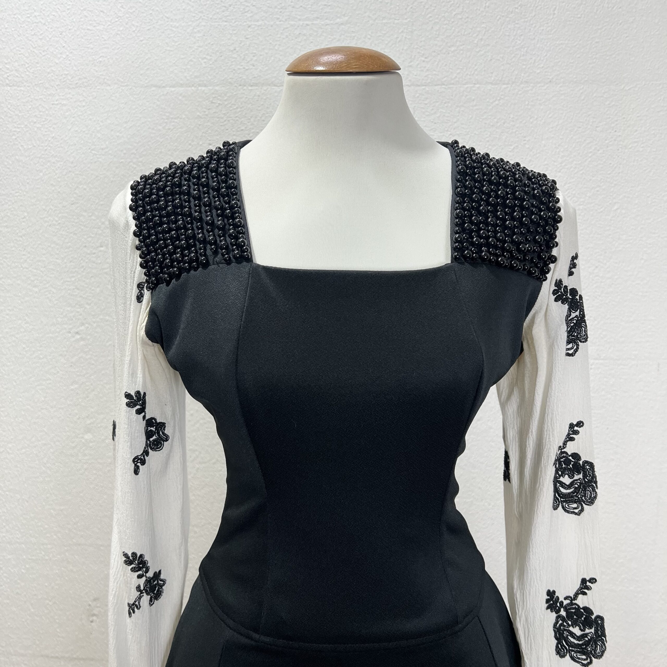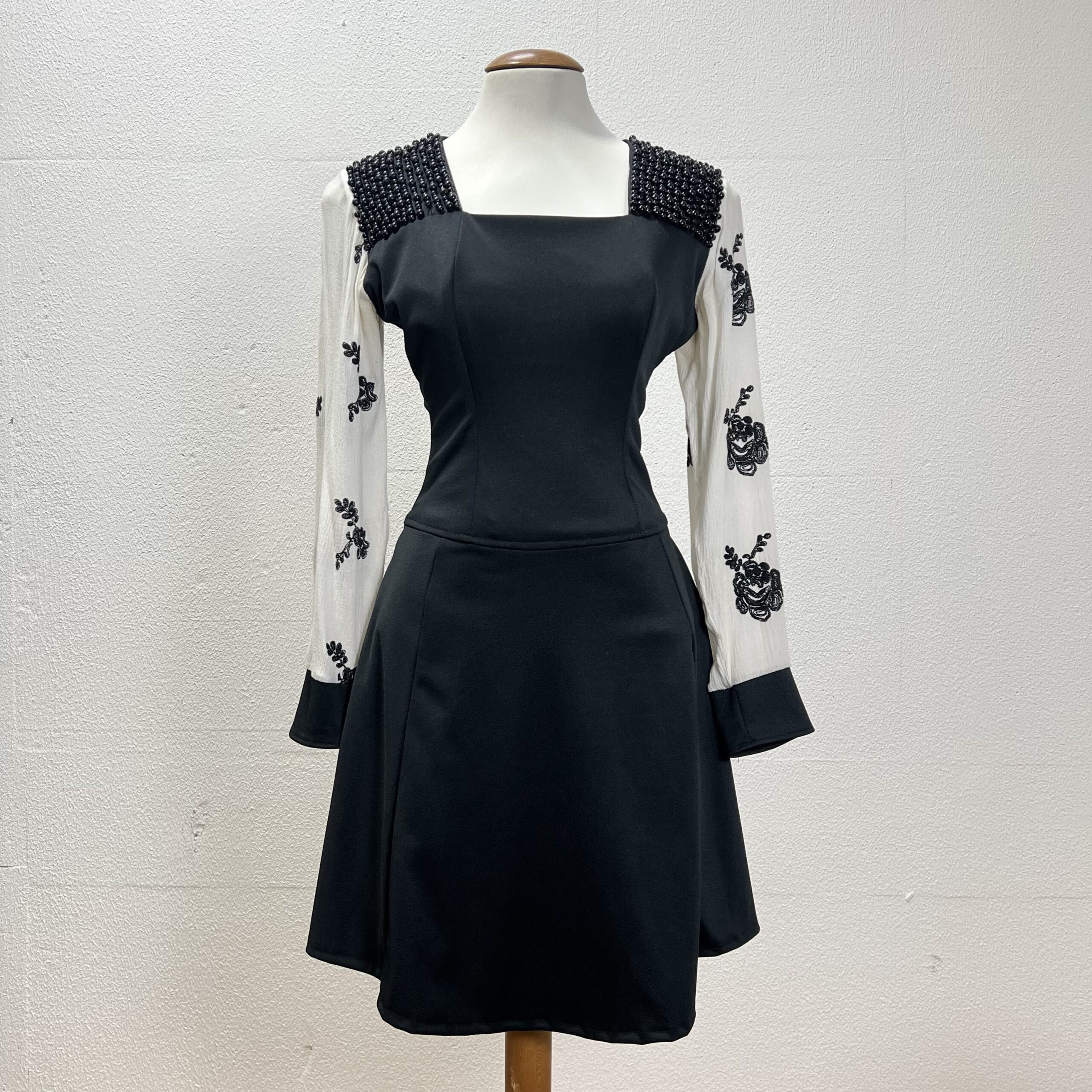 Modelo com decote reto e recortes que valorizam a silhueta. Ombros com aplicação de pedrarias. Mangas longas em tule com bordados florais e punhos em tecido liso. Saia evasê, comprimento acima do joelho. Veste P