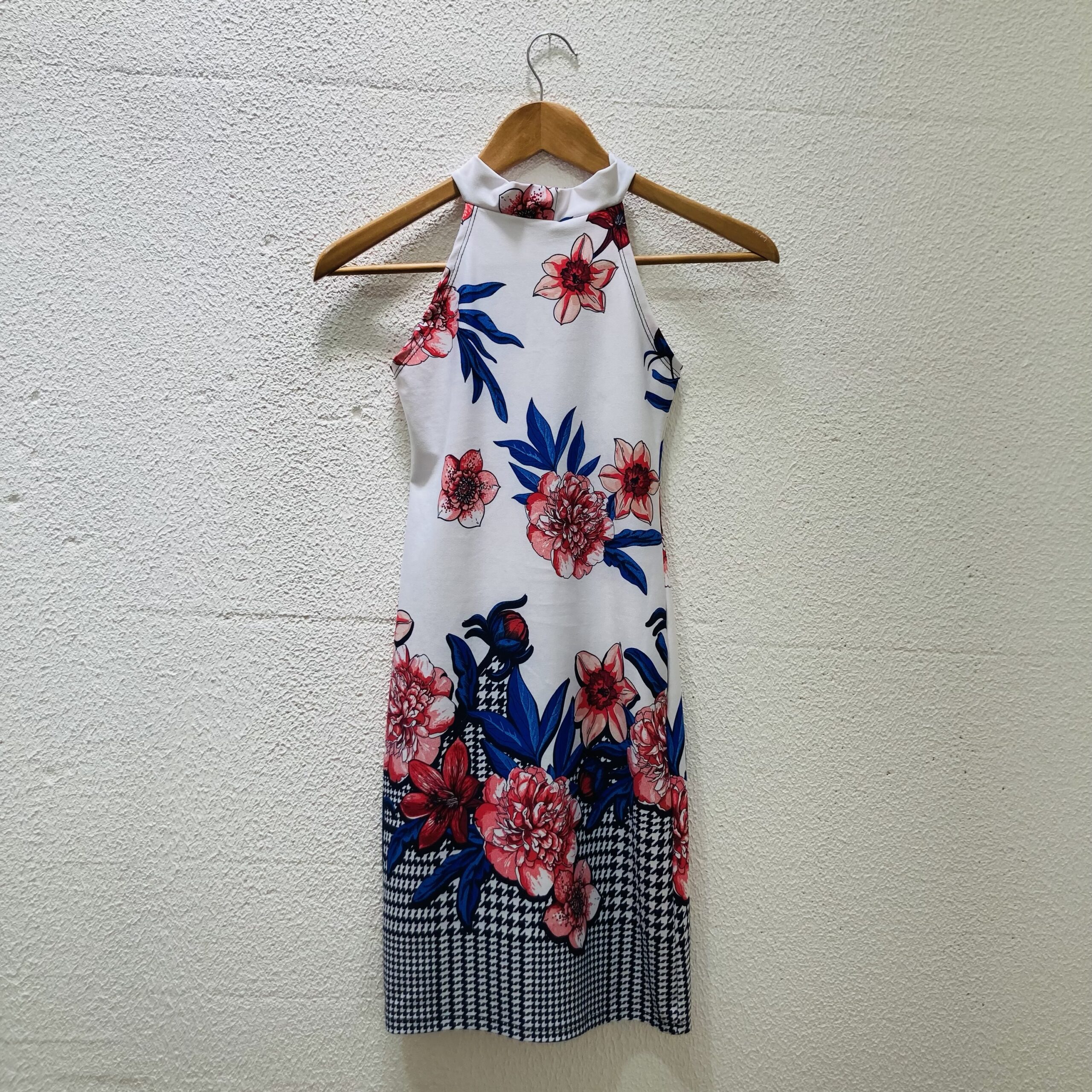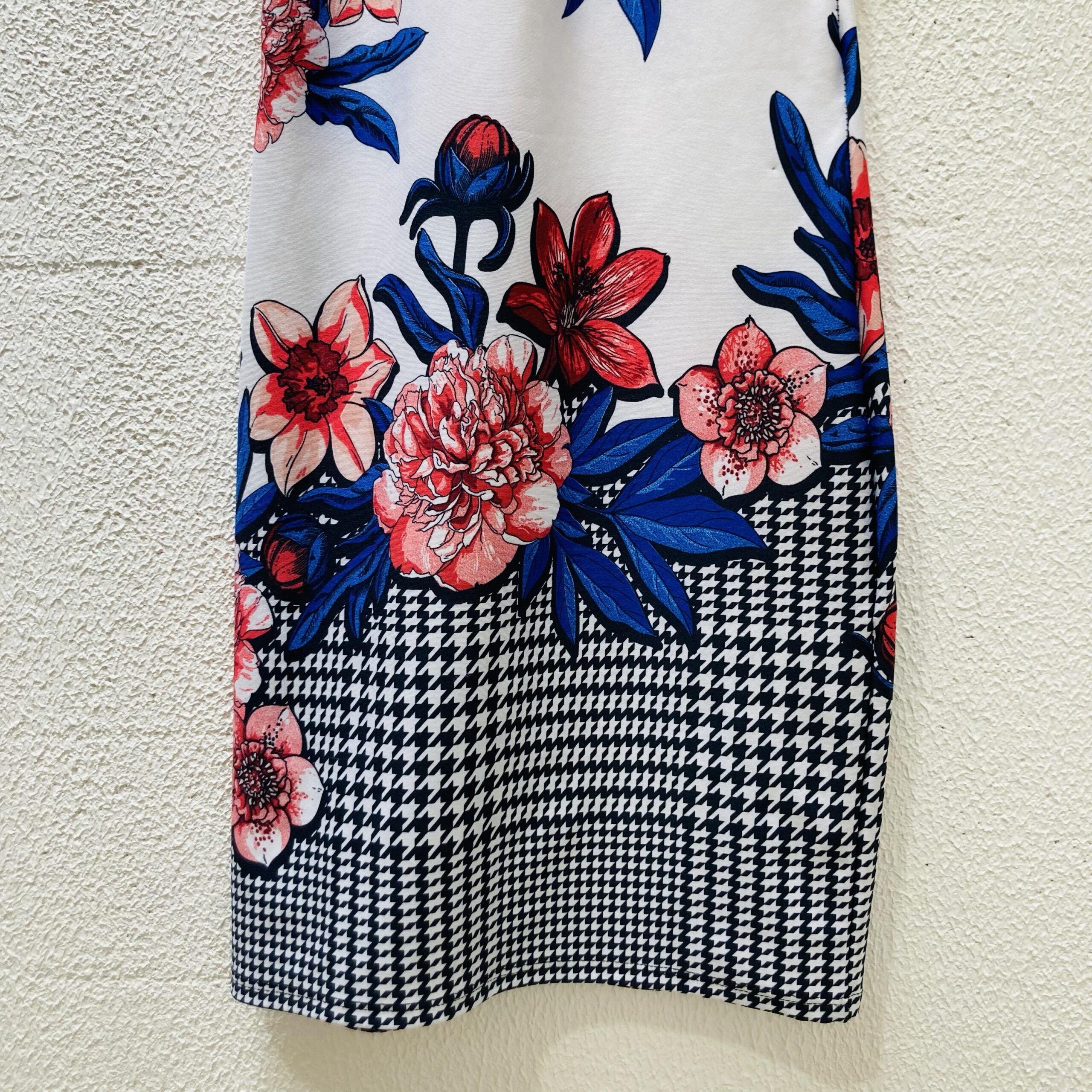 Vestido em poliéster e elastano floral com xadrez na saia.