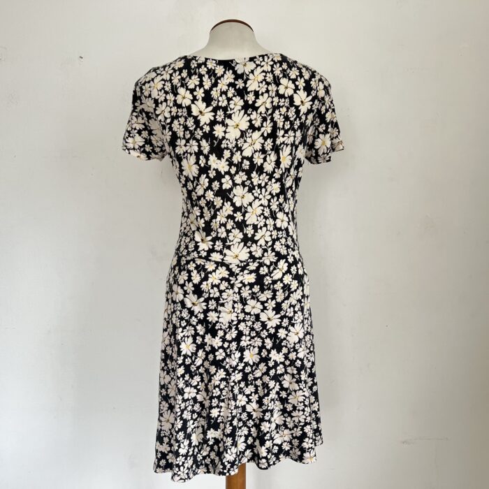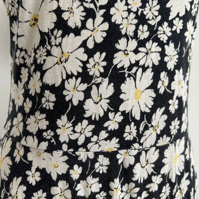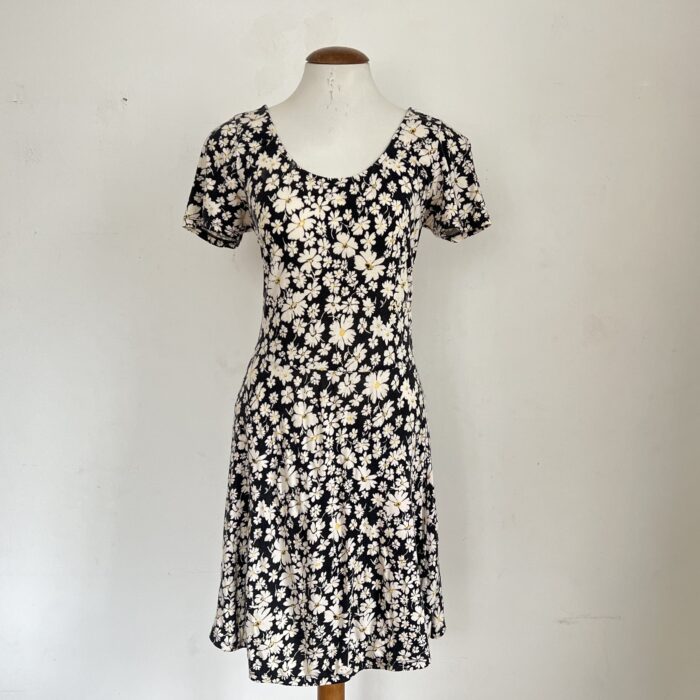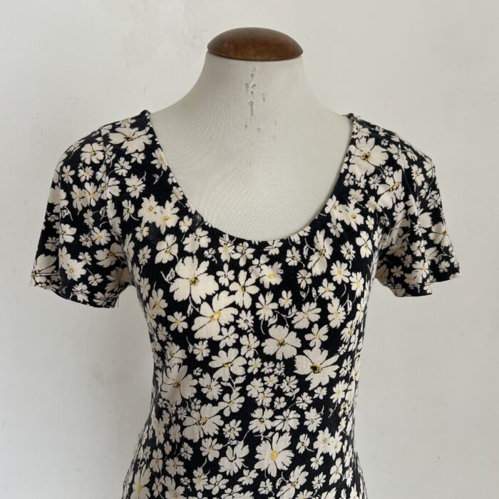 Vestido preto floral em malha, da Forever 21. O tecido estica, e veste P
