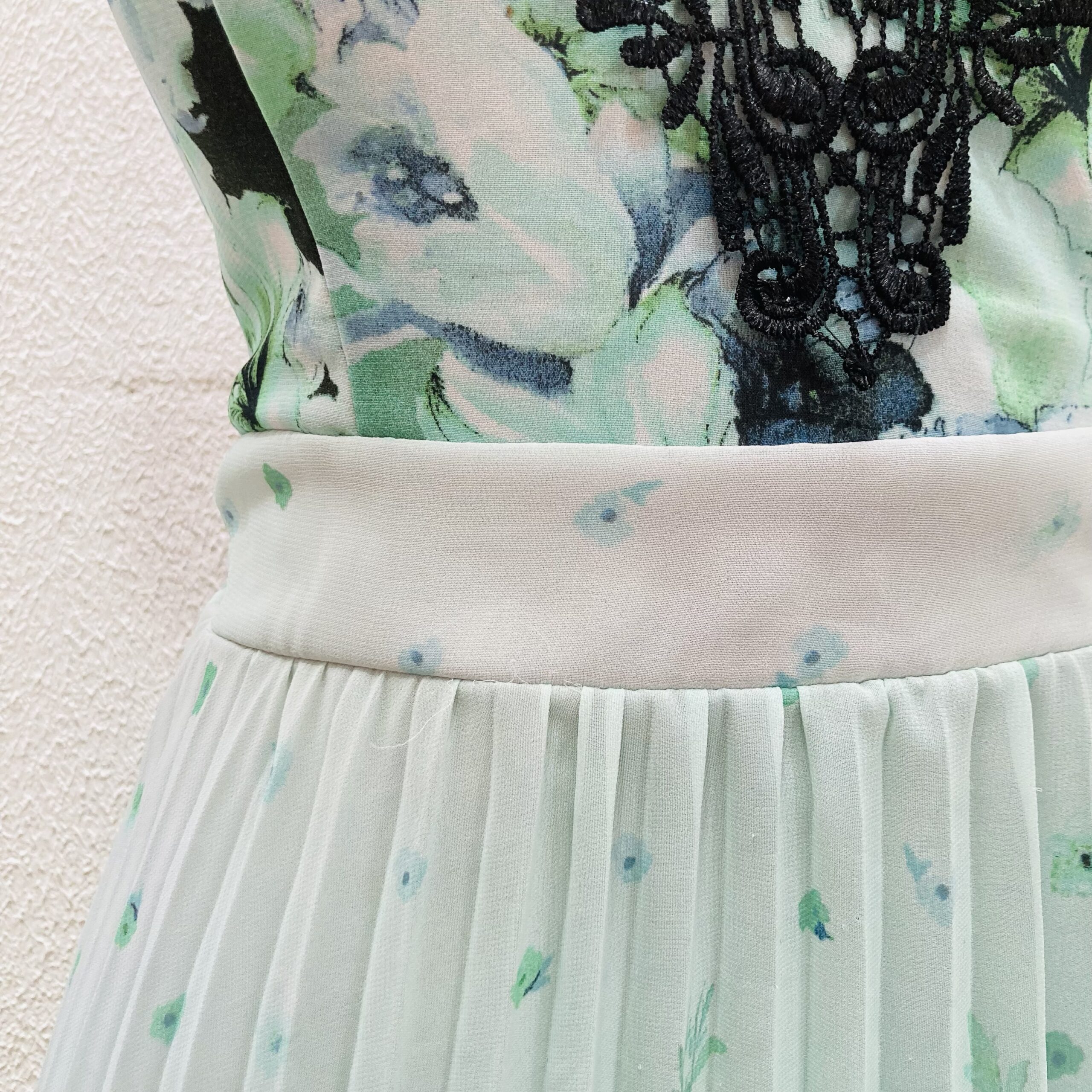 Lindo vestido romântico, em poliéster floral em tons de verde, saia plissada com rendas na barra.