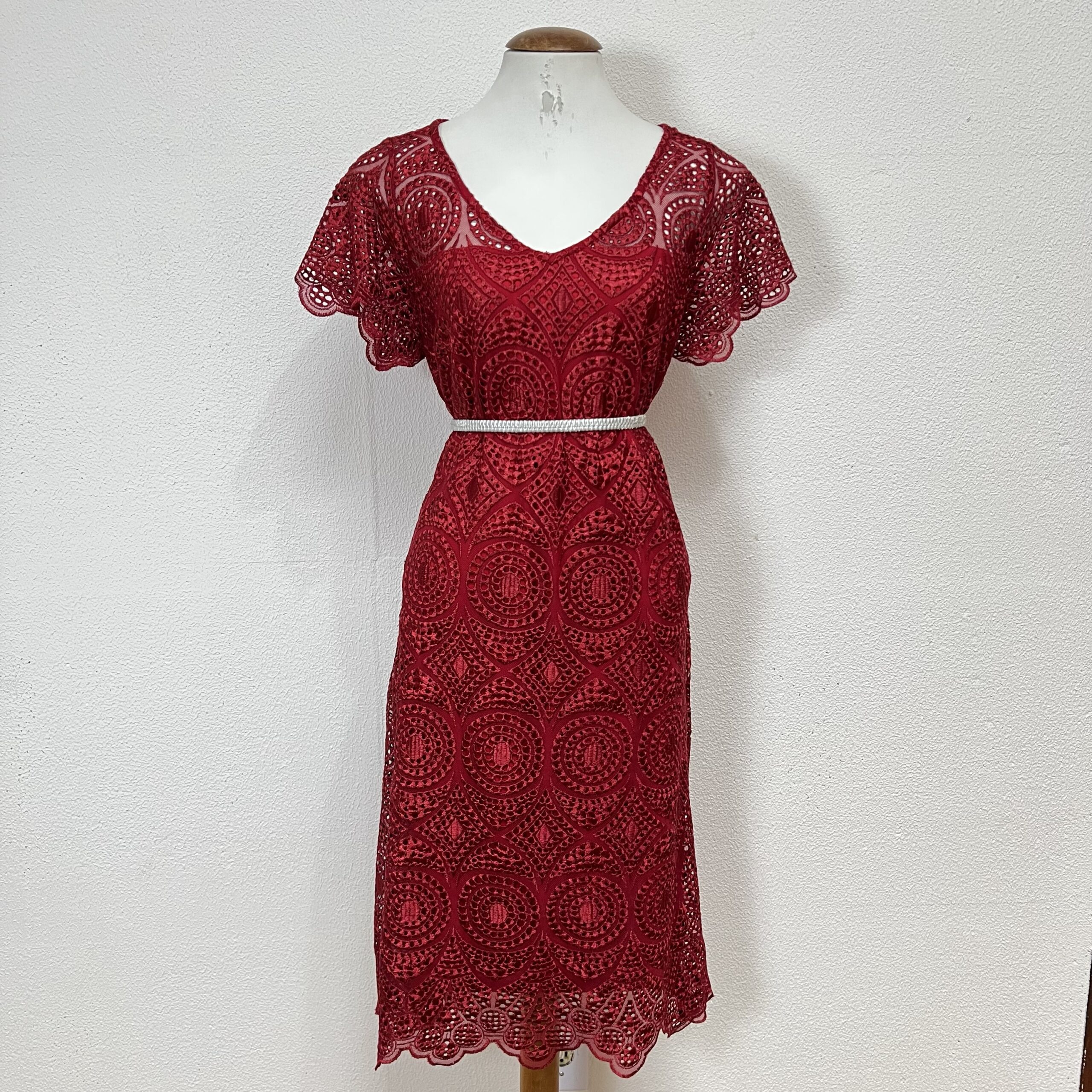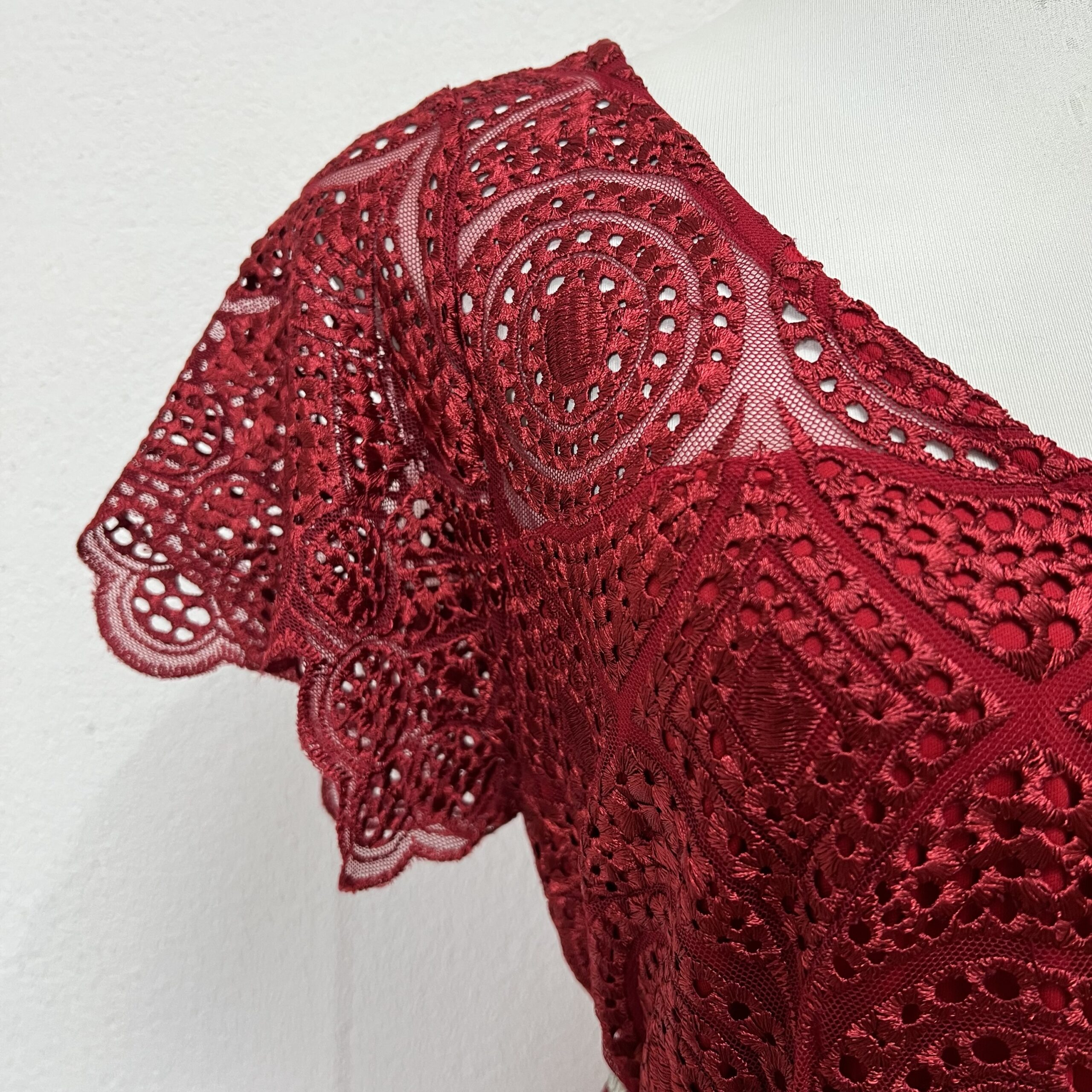 Vestido midi em renda trabalhada, na cor vinho, com mangas curtas delicadas e decote suave. Modelagem ajustada que valoriza a silhueta, com forro interno e acabamento rendado na barra. Elegante e ideal para ocasiões especiais. Veste M